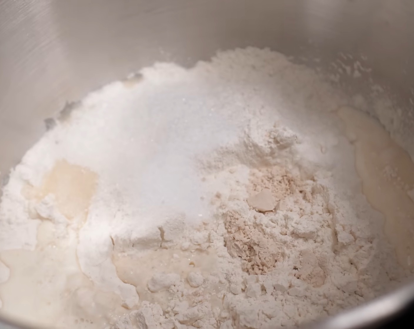 Gewürz-Mischung, Mehl (500 g), Milch (190 g), Zucker (4 Esslöffel), Salz (1 TL) und Hefe (7 g) in der Küchenmaschine auf kleiner Stufe beginnen zu kneten.