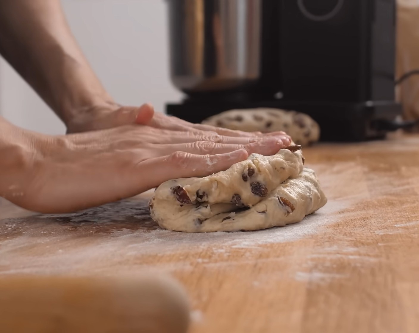 Die Teiglinge auf einer leicht bemehlten Arbeitsfläche leicht flach drücken und mit einem Rollholz zweimal längs Eindrücken, so dass drei Teile entstehen.