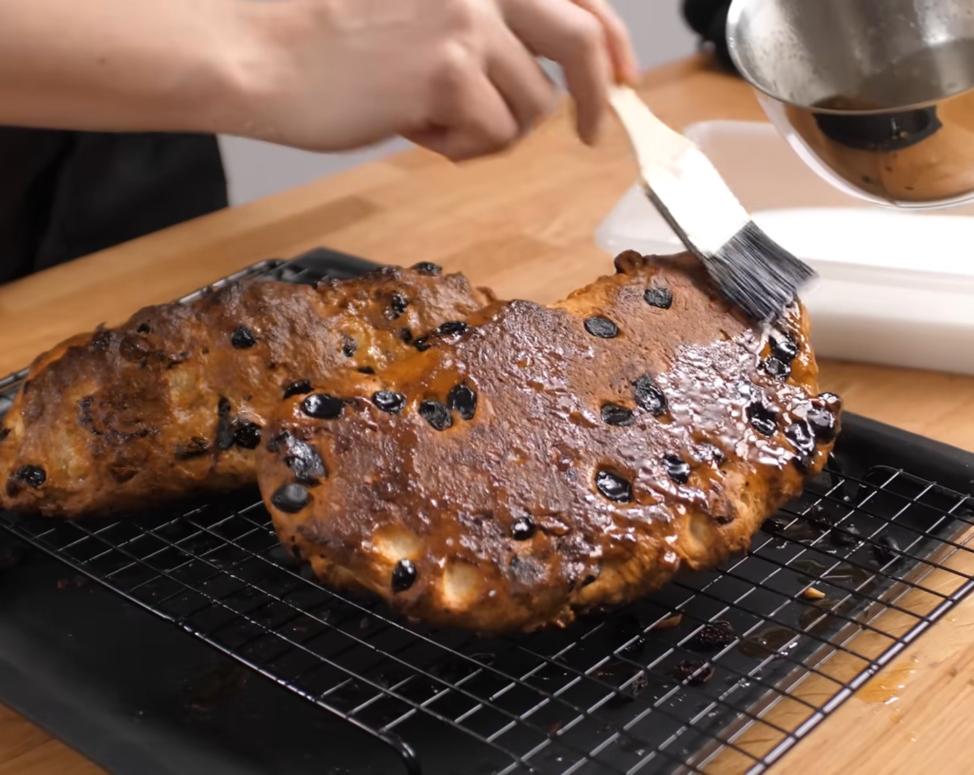 Die noch heissen Stollen direkt aus dem Ofen grosszügig mit der flüssigen Butter bepinseln.