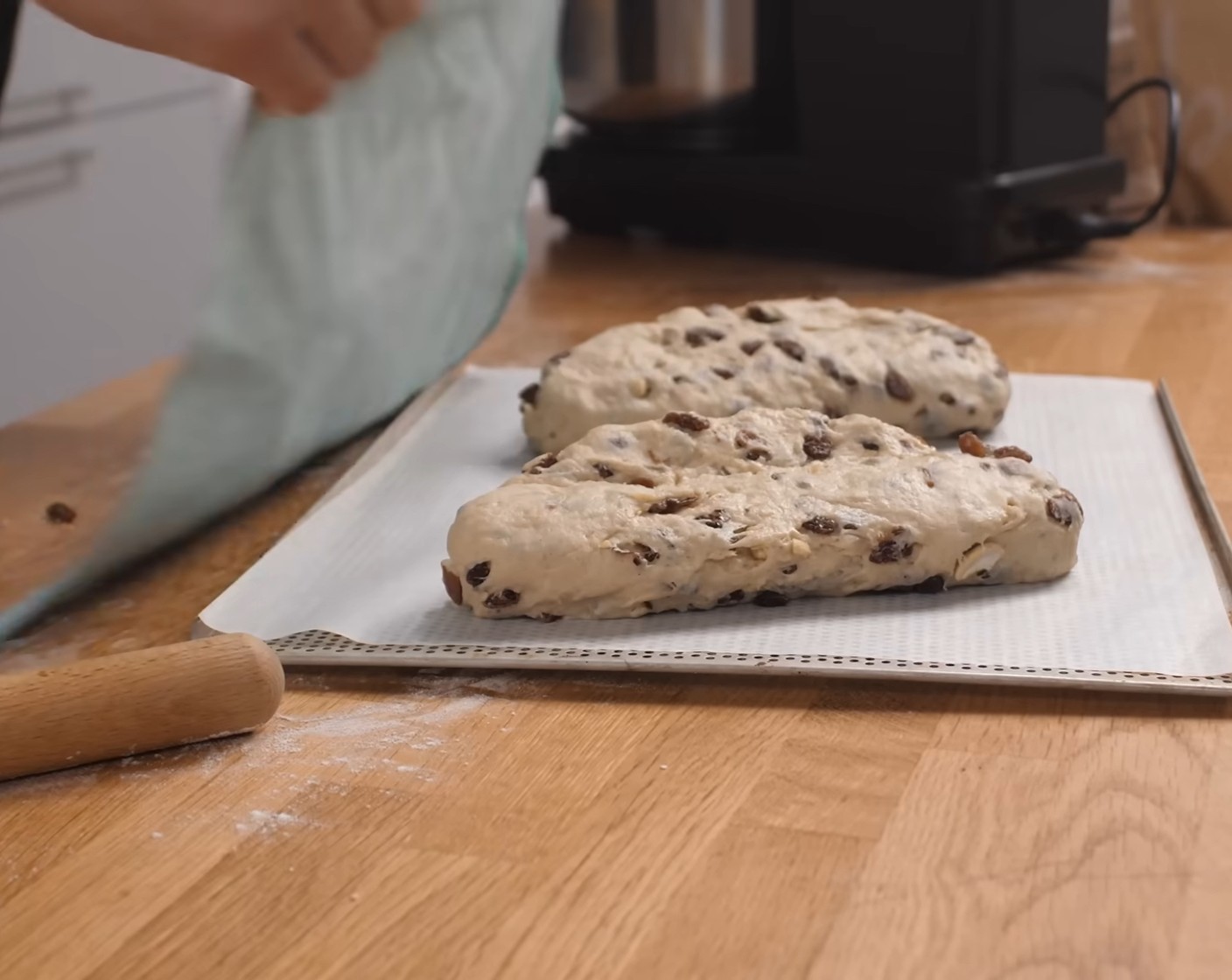 Die beiden Teiglinge auf ein mit Backpapier belegtes Blech legen, zudecken und 1 Stunde bei Raumtemperatur ruhen lassen.