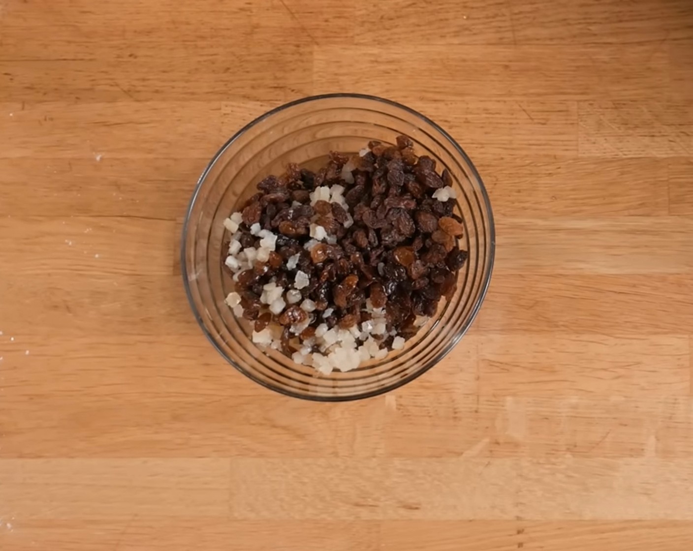 Die Rosinen (380 g) mit dem Zitronat (60 g) in eine Schüssel geben, mit Rum (50 g) übergiessen und gut mischen.
