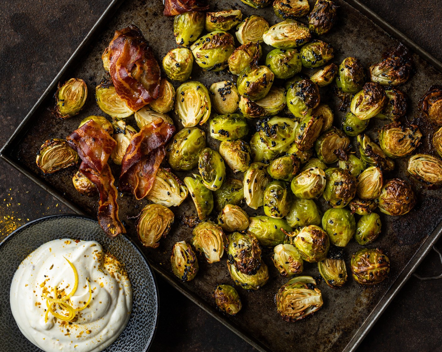 In diesem raffinierten Rezept wird Rosenkohl mit Honig, Sesam und Sojasauce im Ofen geröstet. Dazu knuspriger Speck und Joghurtsauce. Yum Low Carb!