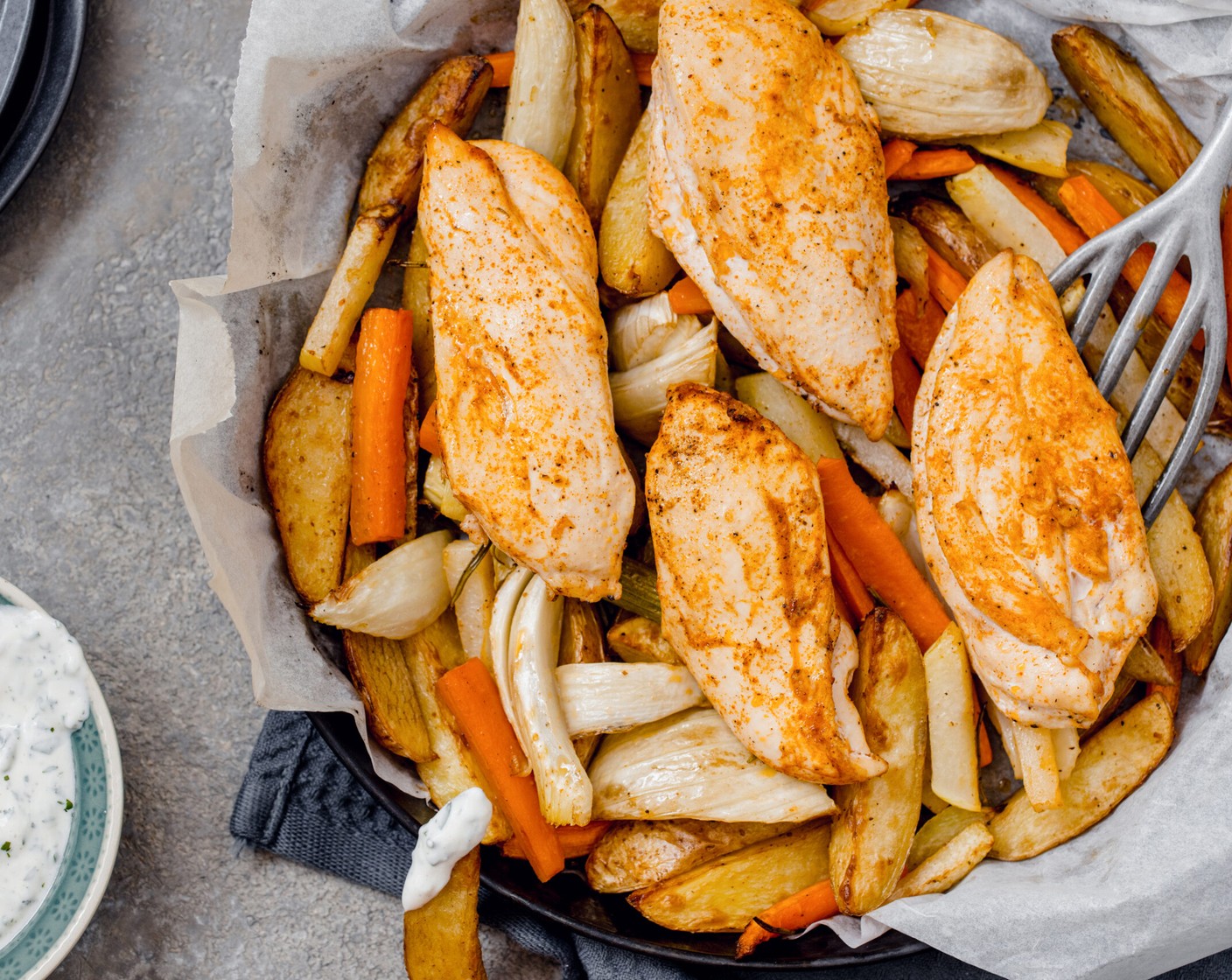 Das Rezept macht einfach Spass. Es macht sich beinahe von selber, ist Low Carb und schmeckt herrlich: Poulet auf Gemüsebett, dazu Kräuterquark. Yummi.