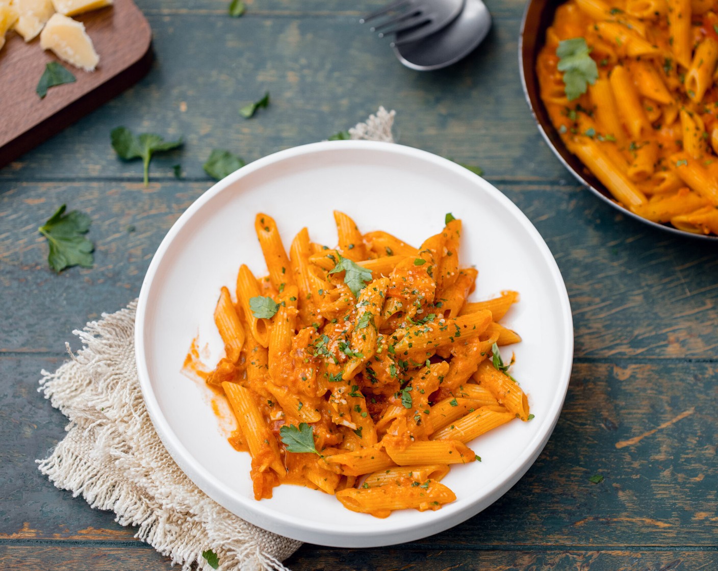 Dieses Rezept für Penne steht innert 25 Minuten auf dem Tisch. Du brauchst nur Pasta, Butter, Zwiebeln, Knoblauch, Vodka, Pelati und Rahm – finito!
