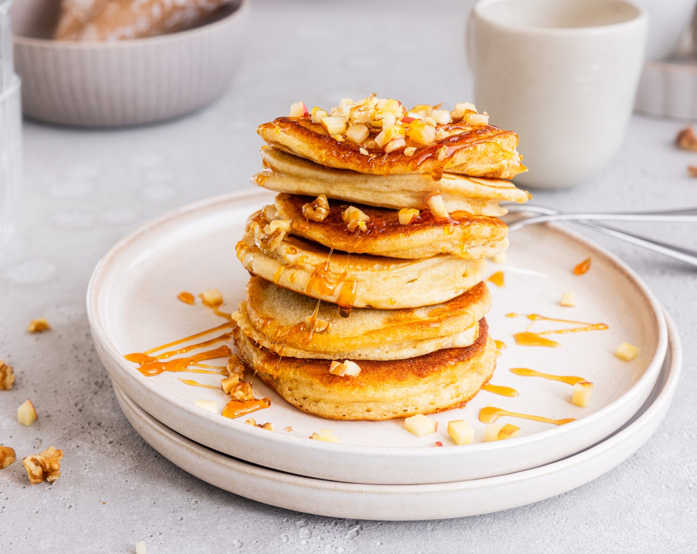Luftig, locker und ein Muss für deinen Brunch: Frische Pancakes auf Basis von Buttermilch schmecken mit Nüssen, Äpfeln und Honig, himmlisch.