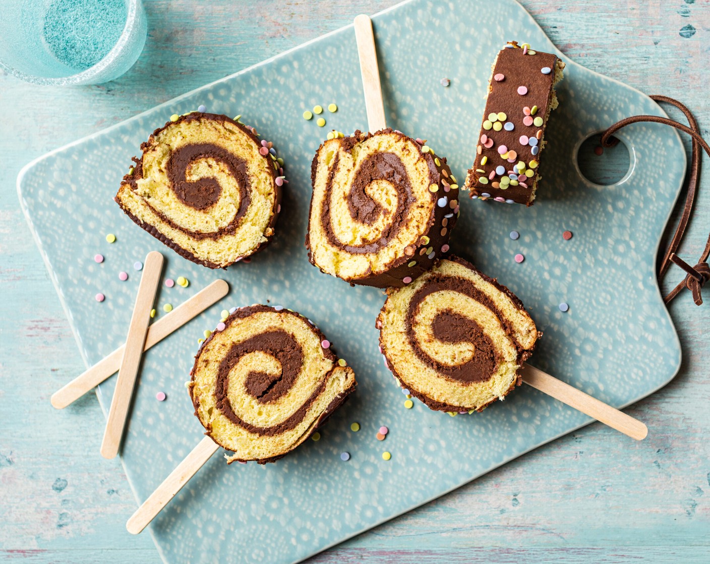 Weshalb Biskuitroulade auf dem Teller essen? Wie wäre es mit unserer Variante als Cake Pops. Feinstes Schokoladenbiskuit am Stiel – das hat Stil.