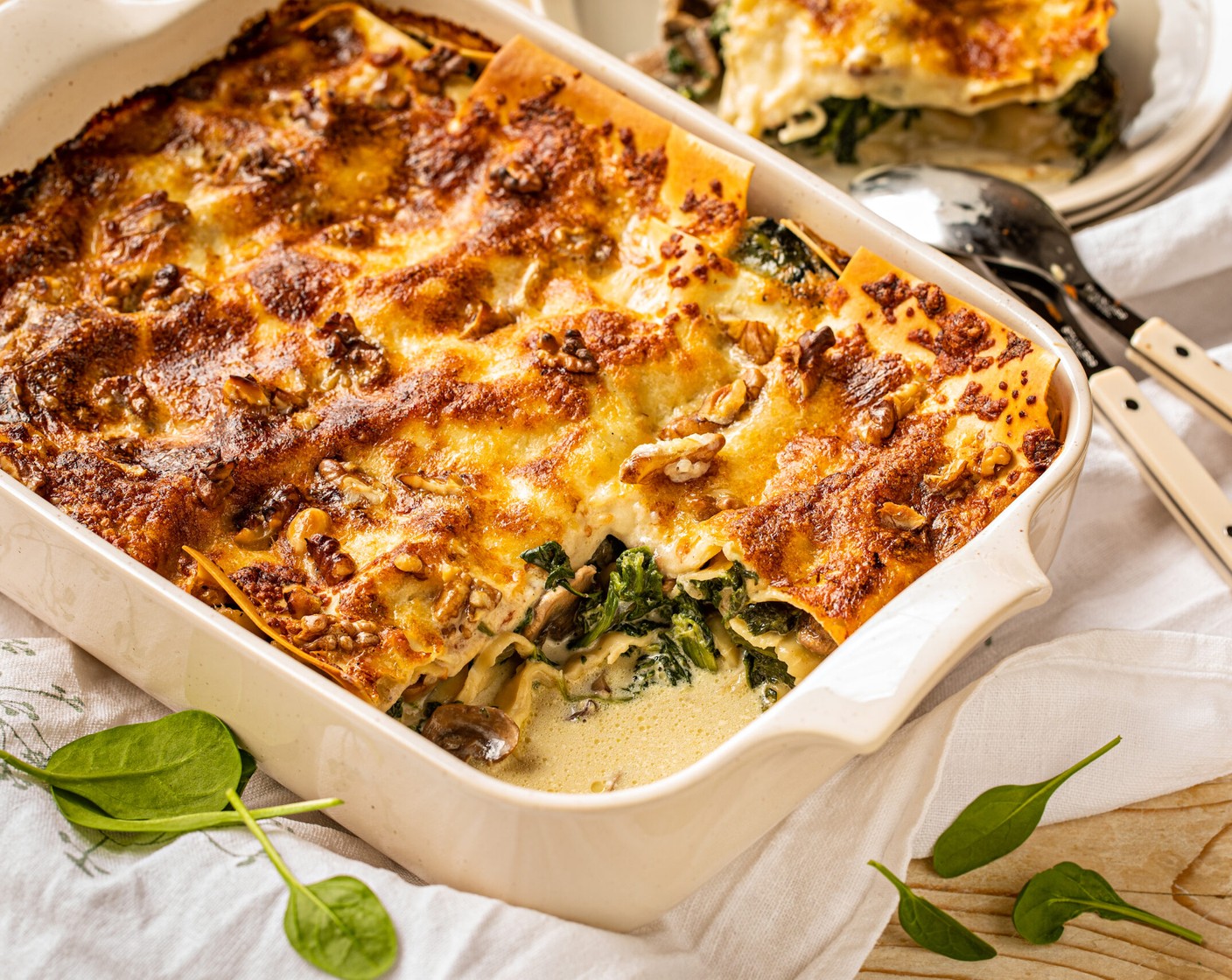 Lust auf ein neues Rezept für Lasagne? Diese vegetarische Variation mit Pilzen, Spinat, würziger Käsesauce und gehackten Nüssen ist eine Offenbarung.