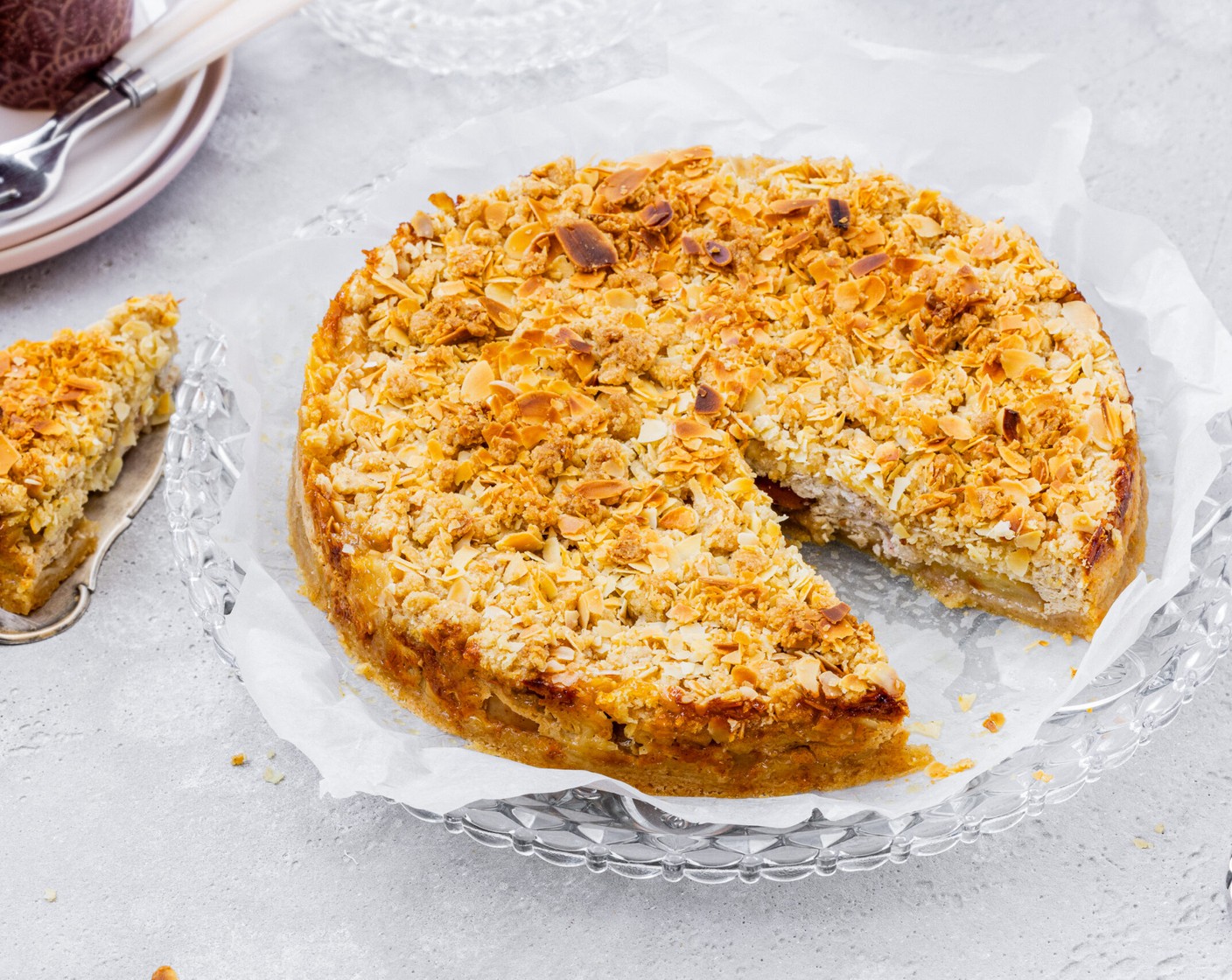 Ein herrlicher Streuselkuchen: mit Äpfeln und feiner Quarkmasse, darüber kommen Streusel mit Mandeln.