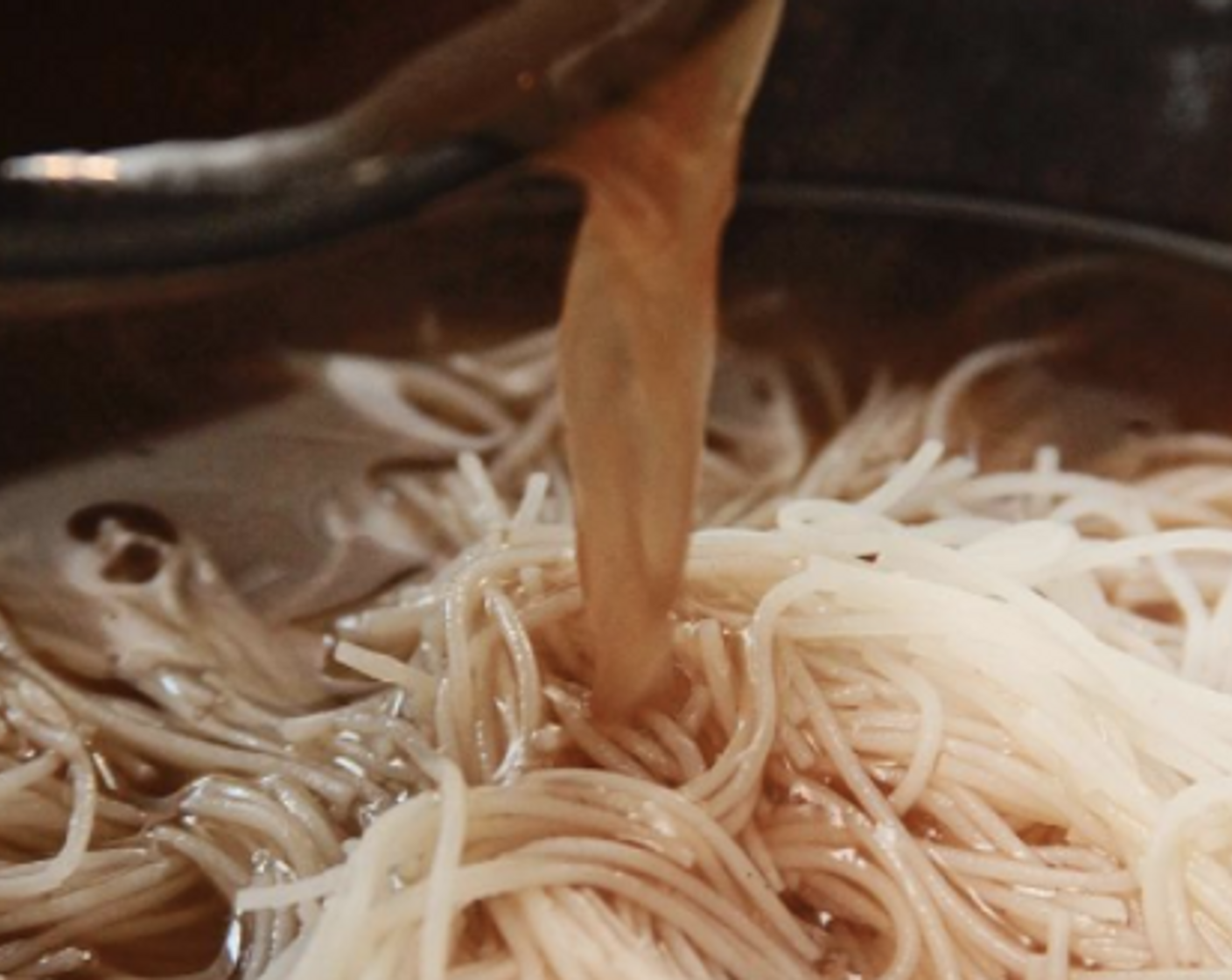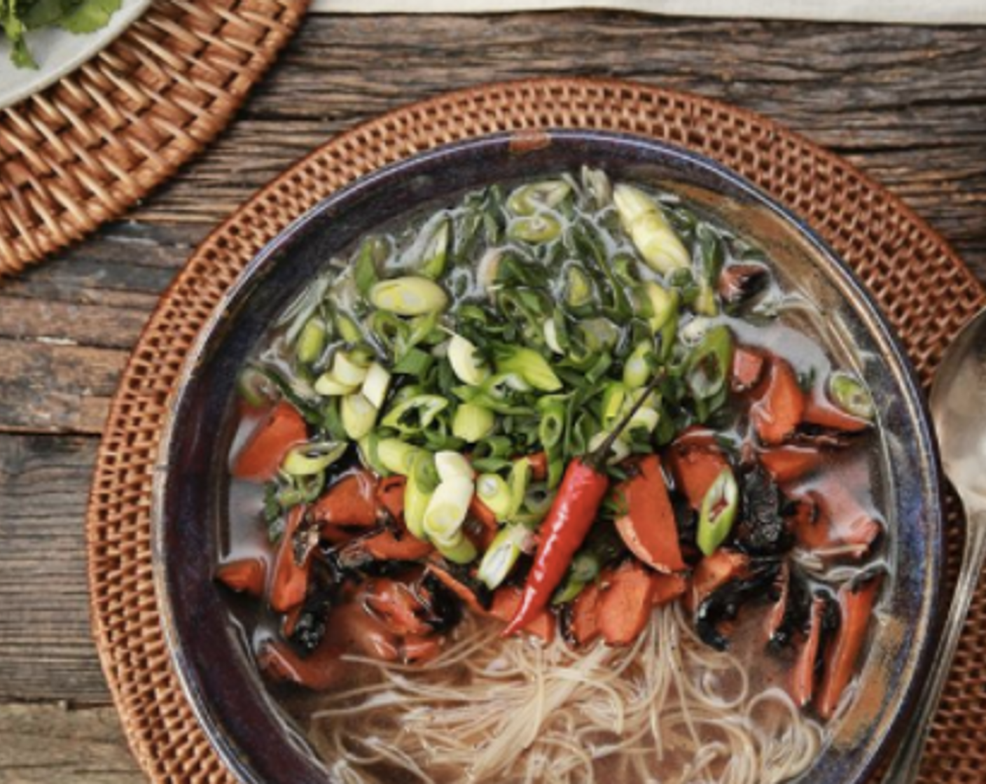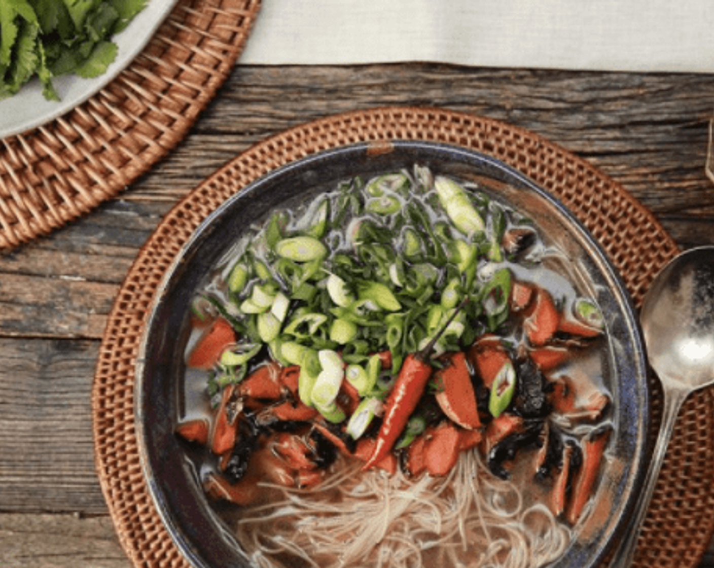 Aufruf an alle Pho-Fans. Diese vegetarische Version ist leicht, mit komplexen Geschmackskomponenten aus gut gebräunten Karotten und Frühlingszwiebeln. Während der Zubereitung dieses Gerichts strömen herrliche Düfte durchs ganzen Haus! Gewürznelken, Fenchelsamen, Anis, frisches Thai-Basilikum, Ingwer und Knoblauch verleihen diesem Gericht den vertrauten Pho"-Geruch und -Geschmack, aber auf eine völlig frische und unkonventionelle Weise. Sojabohnensprossen bringen in die zarten Reisnudeln eine knackige Textur.