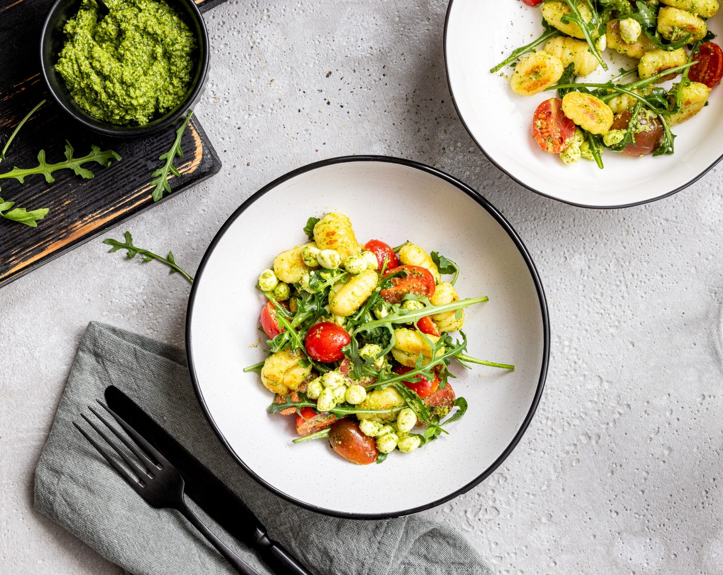 Der perfekte Sommersalat für draussen auf dem Balkon oder als Lunch zum Mitnehmen. Gnocchi, Rucola, Tomaten, Mozzarella und Pesto – buonissimo!