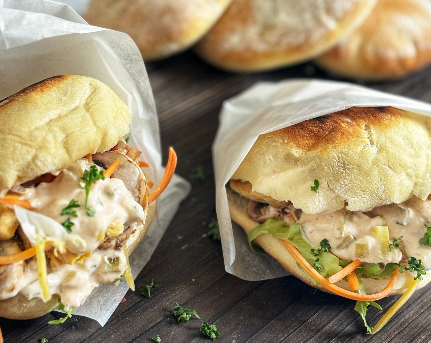 Magerquark-Fladenbrot mit Hamburgersauce und Pouletbrüstchen
