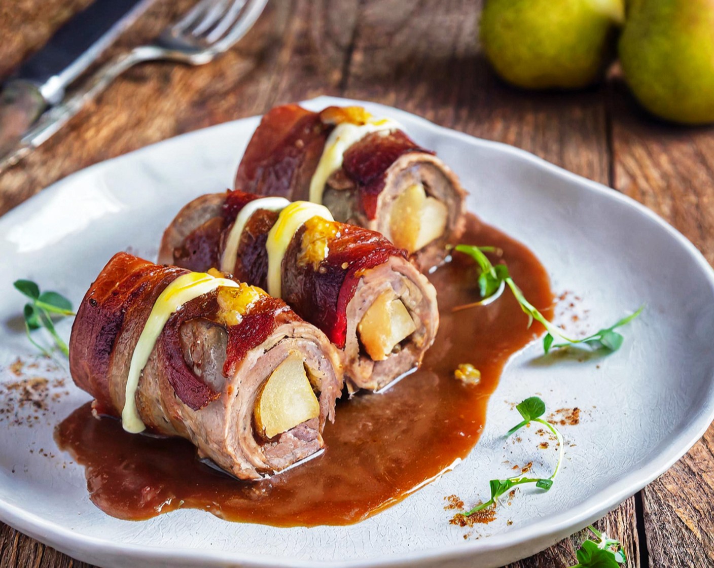 Saftplätzli mit Birnen-Weichkäsefüllug im Speckmantel
