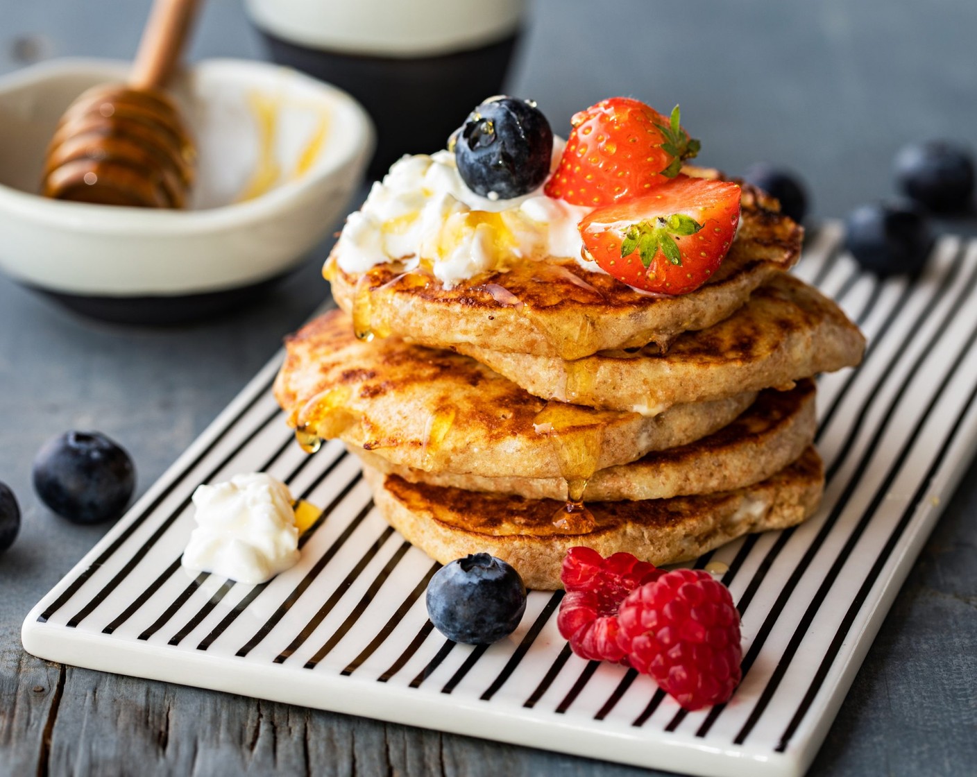 Pancakes aus Vollkornmehl und Hüttenkäse. Dazu Ahornsirup und frische Beeren – ahh! Das ist DAS gesunde, natürliche Proteinrezept. Chochdoch mit Muriel.