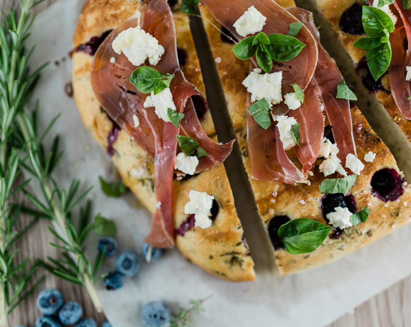 Das italienische Fladenbrot mal anders! Diese Focaccia mit Blaubeeren, Rohschinken, Fetakäse und Basilikum wird bestimmt deine Gäste überraschen. Die Focaccia lässt sich sehr einfach im Steamer oder Dampfgarer zubereiten und ist die perfekte Beilage zu einem Glas Wein bei einem Apèro oder beispielsweise bei einem Grillfest oder zu einem Salat.