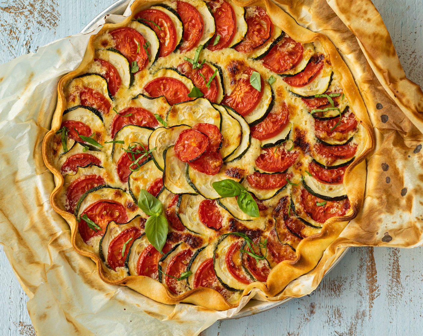 Schmackhafte Wähe für den Sommer, mit Zucchini, Tomaten, Crème fraîche und Gruyère.