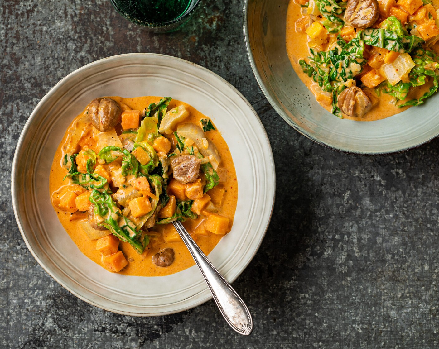 Ein raffiniertes Curry. Es wird aus Kürbis, Krautstiel, Wirz und Marroni zubereitet. Eine Wucht und vegetarisch.