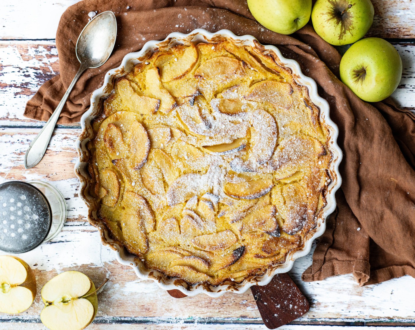 Dieser köstliche Clafoutis wird aus Äpfeln mit einem Guss aus Eiern, Rahm, Mehl, Vanille und einem Schuss Calvados gebacken. Ein tolles Dessert.