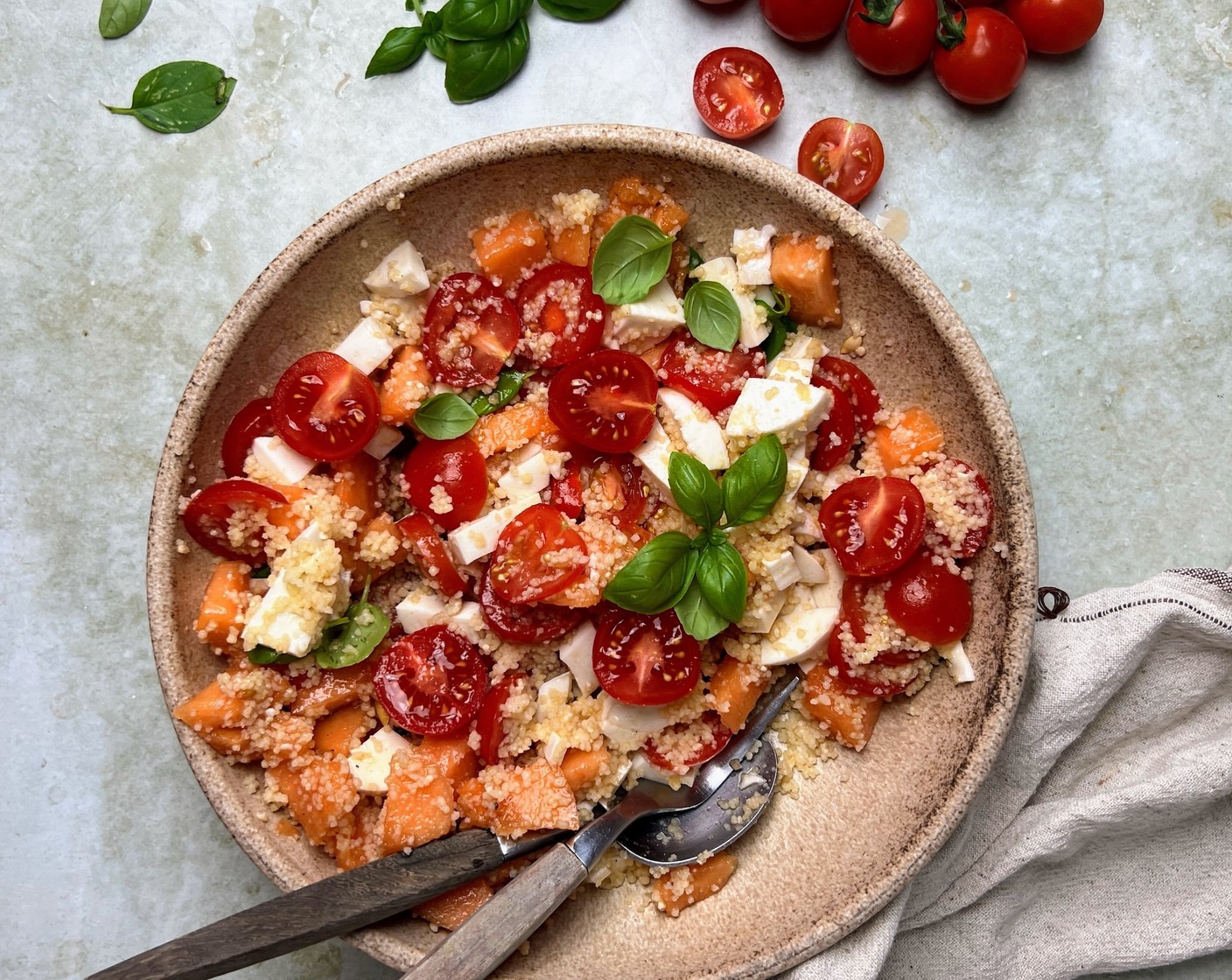 Der Sommer ist die perfekte Gelegenheit für einen Salat. Hier mit Melone, Tomate, Mozzarella und Couscous.