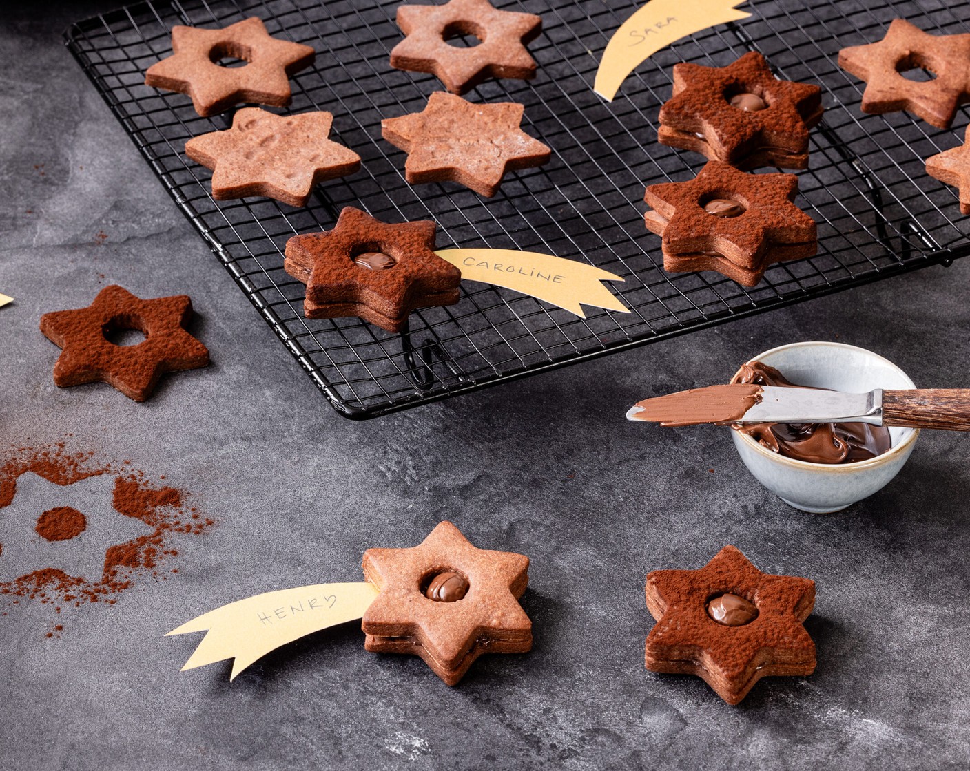 Süsse Namensschildchen. Diese feinen Spitzbuben mit Kakao werden mit Schokoladenaufstrich oder Johannisbeergelee gefüllt.