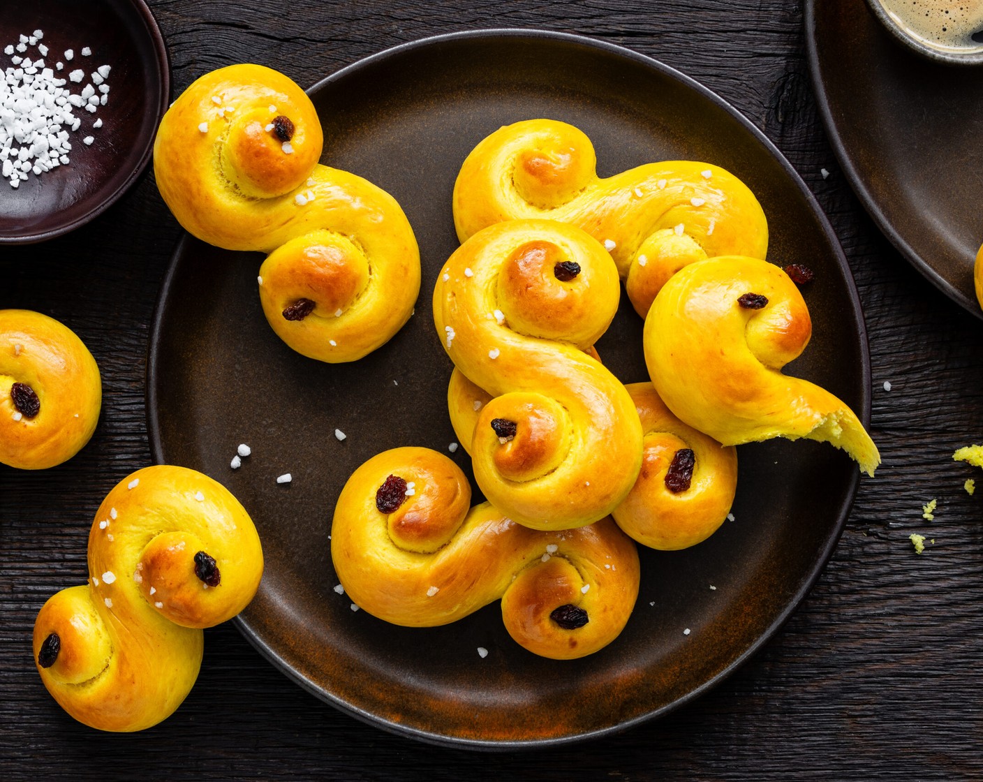 Wunderbar zart ist diese schwedische Spezialität: Luciakatzen. Feinstes Hefegebäck mit einem Hauch Safran. Zum Brunch mit Butter, Konfi oder einfach pur geniessen.
