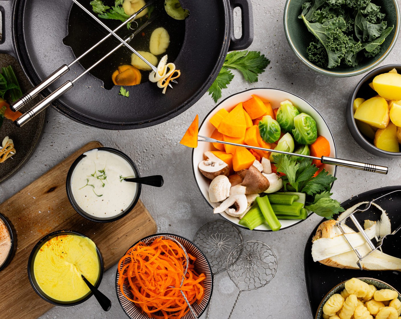 Das bunteste und variantenreichste Fondue Chinoise, das du je gesehen hast. Mit knackigem Gemüse, Kartoffeln, Pilzen und Pasta. Dazu feine Saucen.