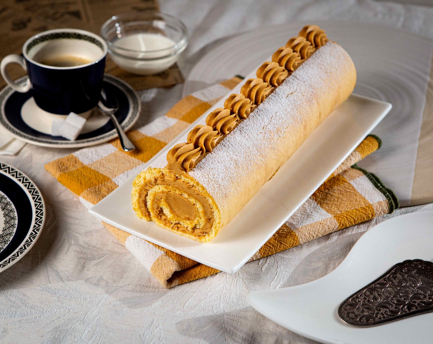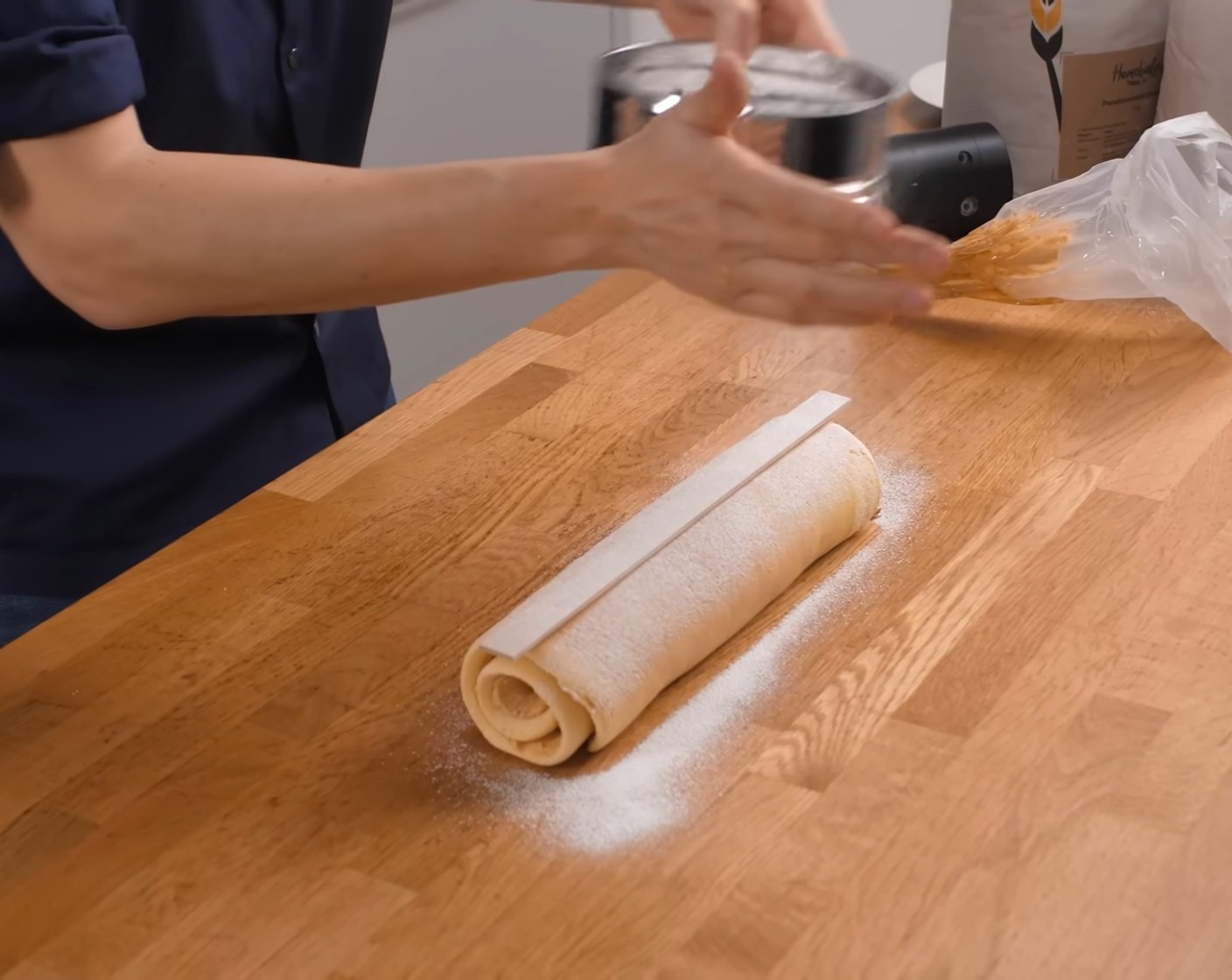 Einen Ausrollstab mittig auf die Biskuitrolle legen und mit etwas Puderzucker (nach Bedarf) stauben.