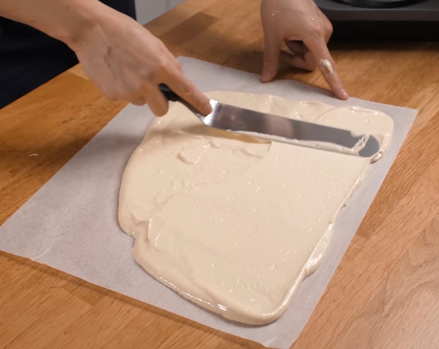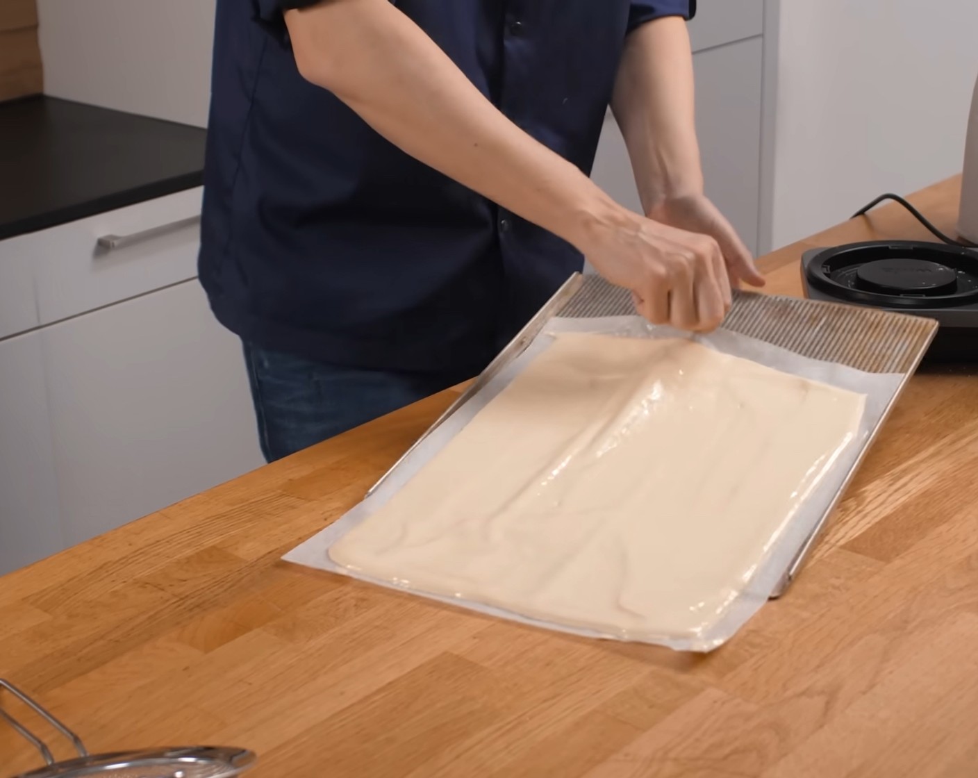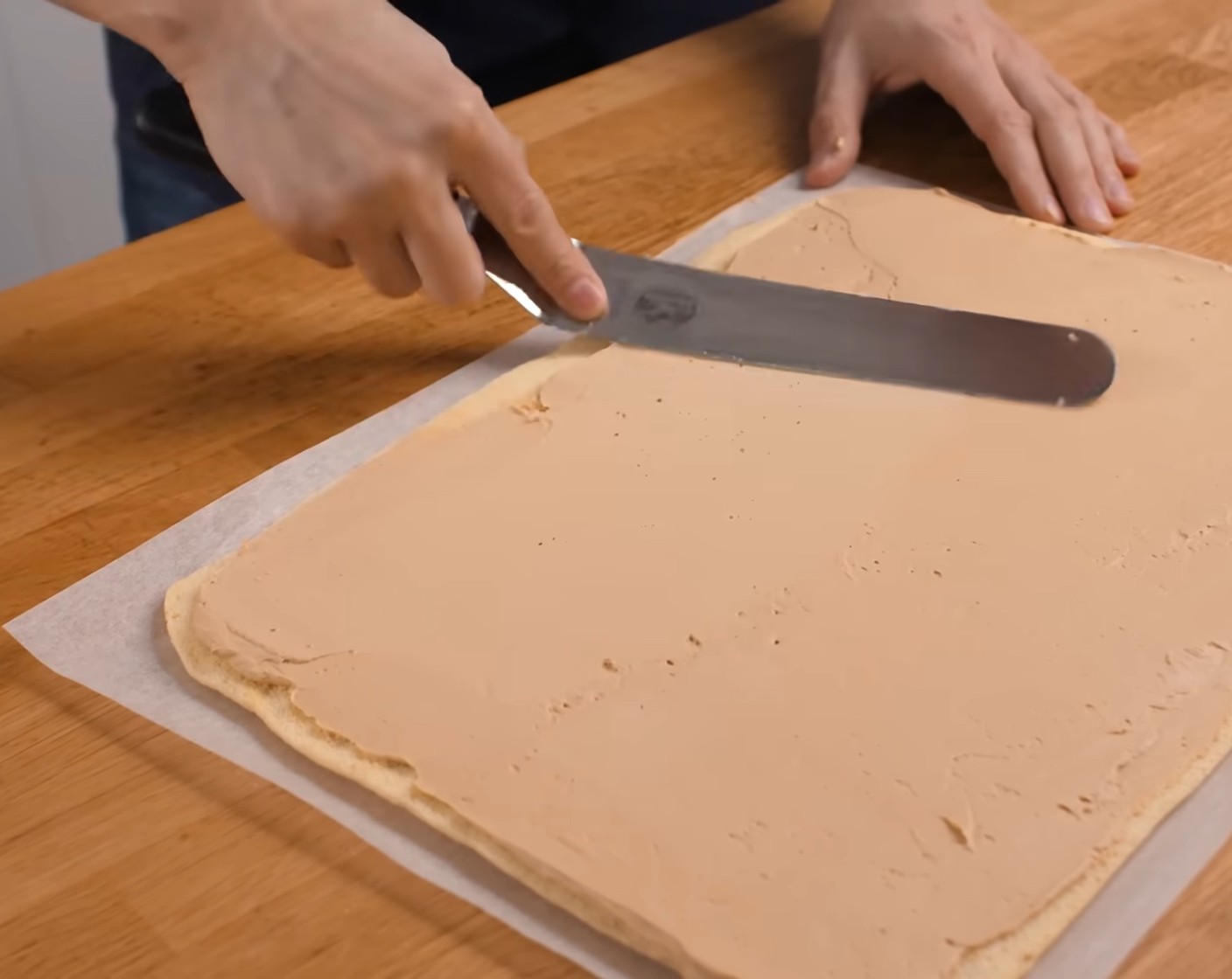 Die Biskuitmasse auf ein Backpapier (40×35 cm) gleichmässig verteilen und verstreichen.