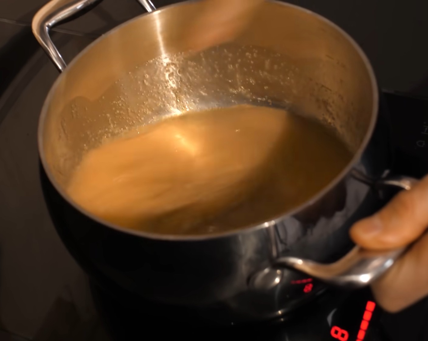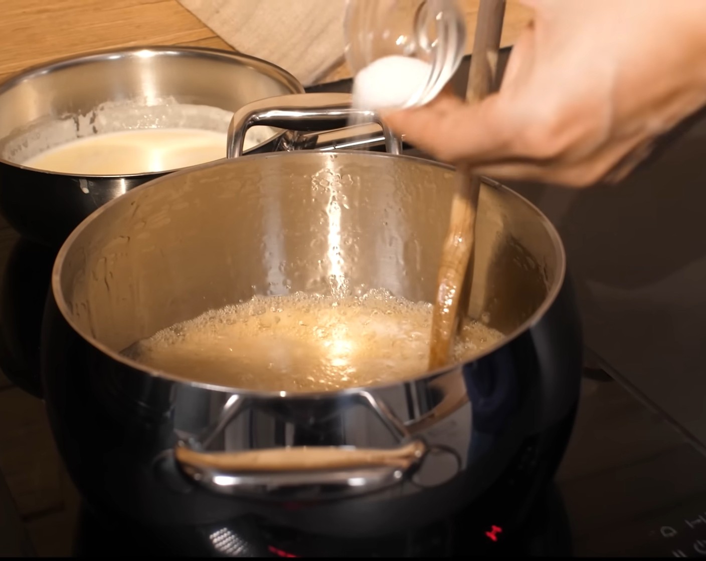 Das Wasser (70 g) zum Zucker (210 g) geben und in einem grossen Kochtopf auf dem Herd karamellisieren lassen.