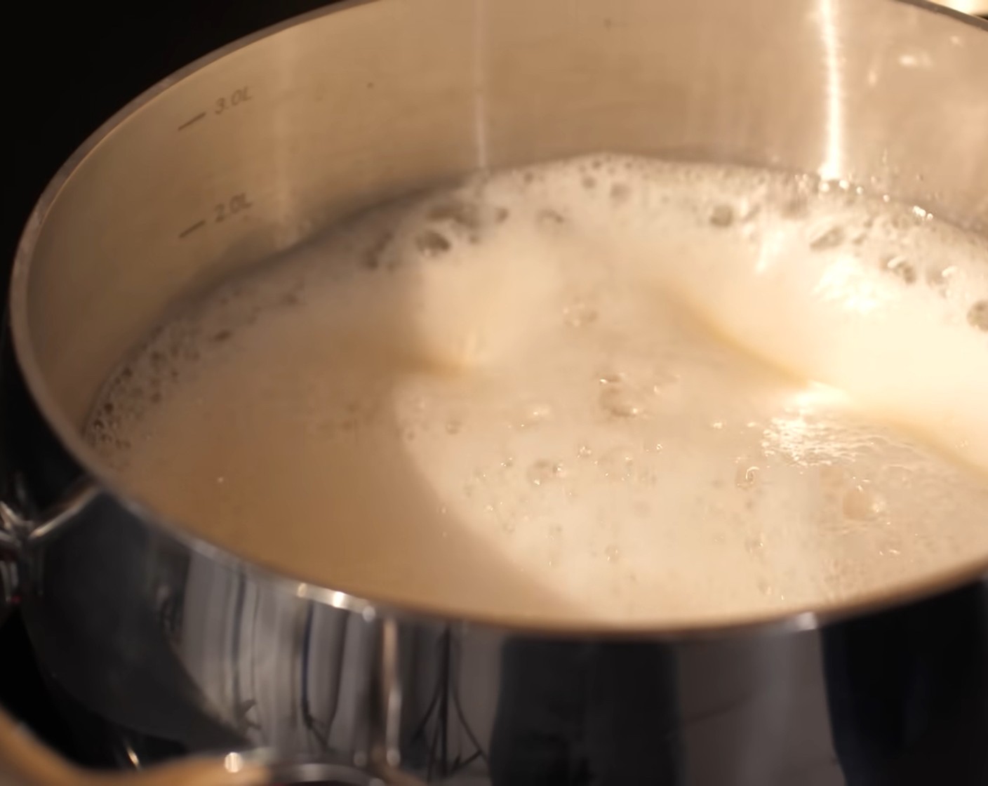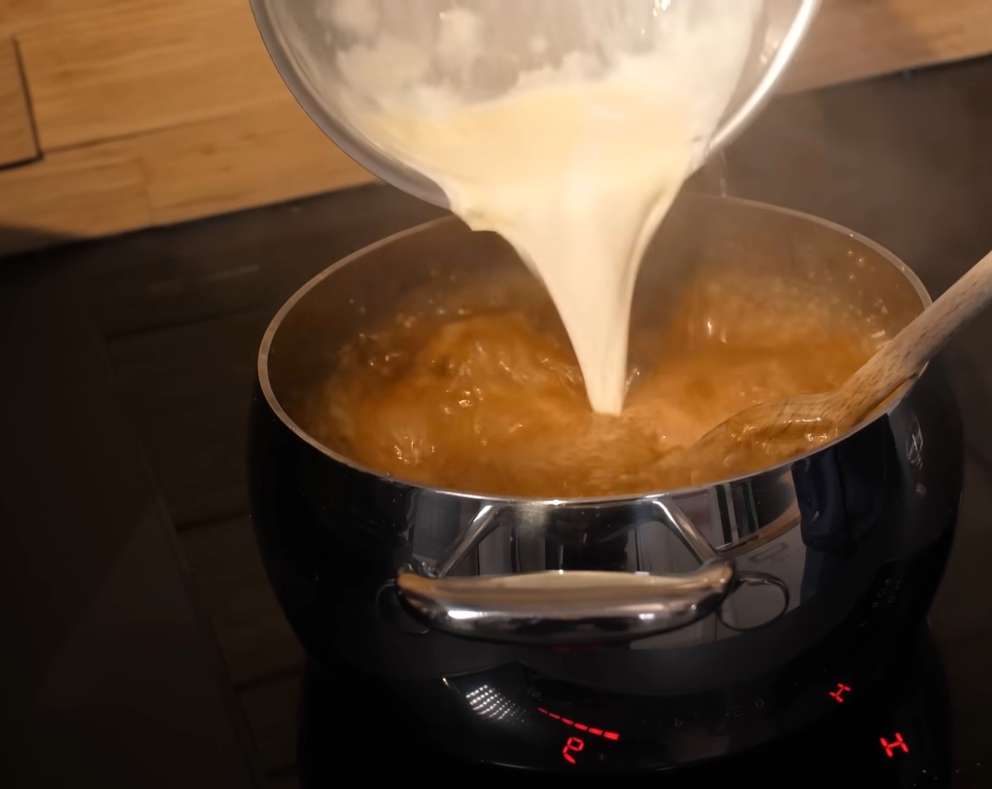 Parallel dazu die Rahm (440 g) in einem Kochtopf auf dem Herd aufkochen.