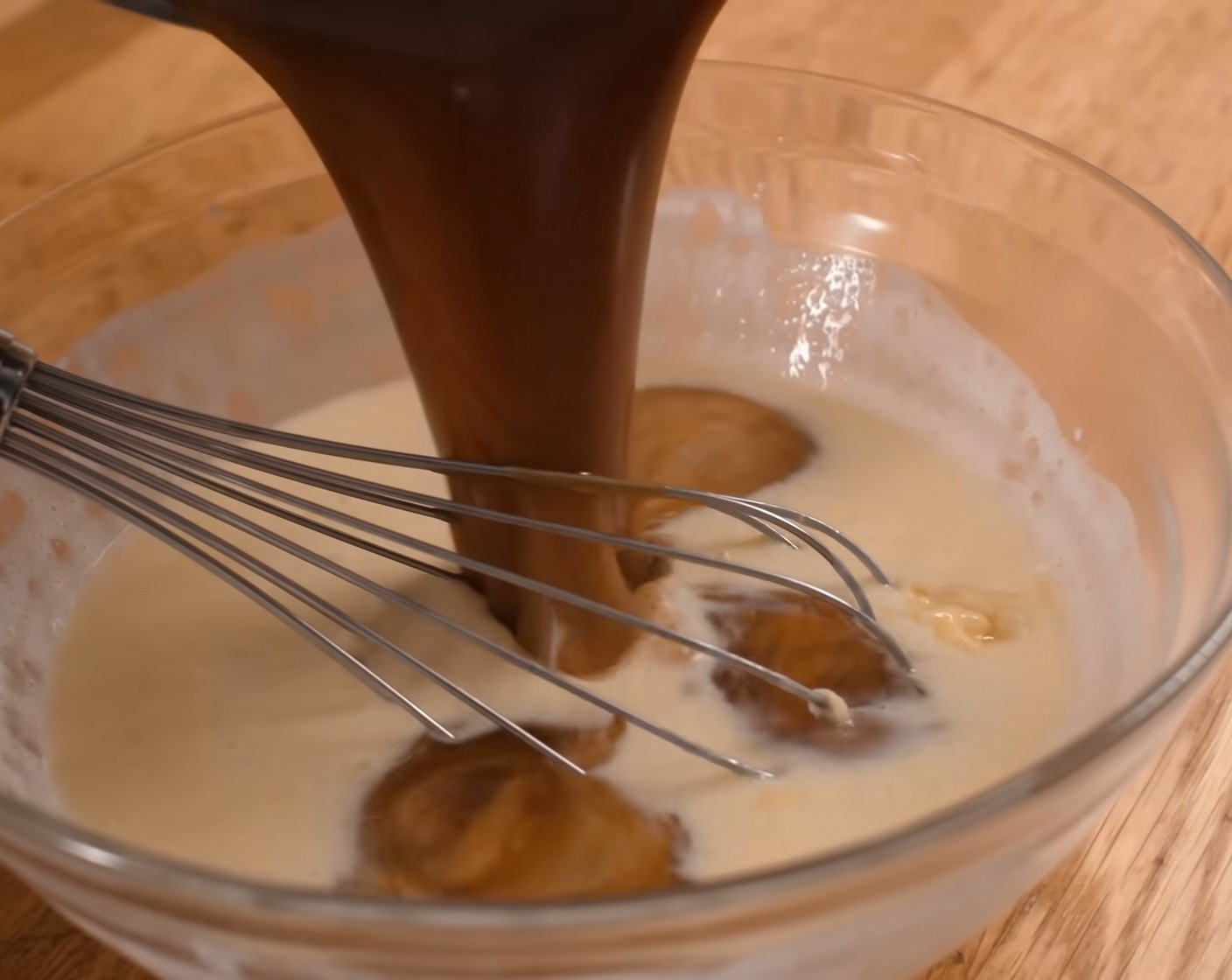Anschliessen etwa die Hälfte der aufgekochten Sahne zur Kuvertüre giessen und alles klumpenfrei vermischen.