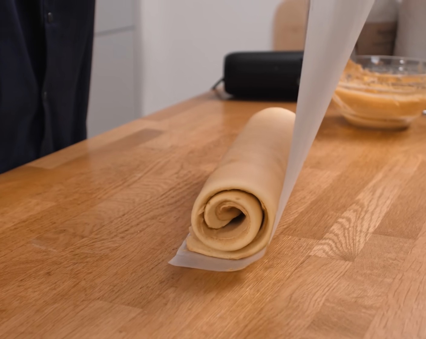 Anschliessend die Biskuitrolle vom schmalen Rand so satt wie möglich, bis etwa in die Mitte einzurollen. Danach mit Hilfe des Backpapiers den Biskuit fertig rollen.