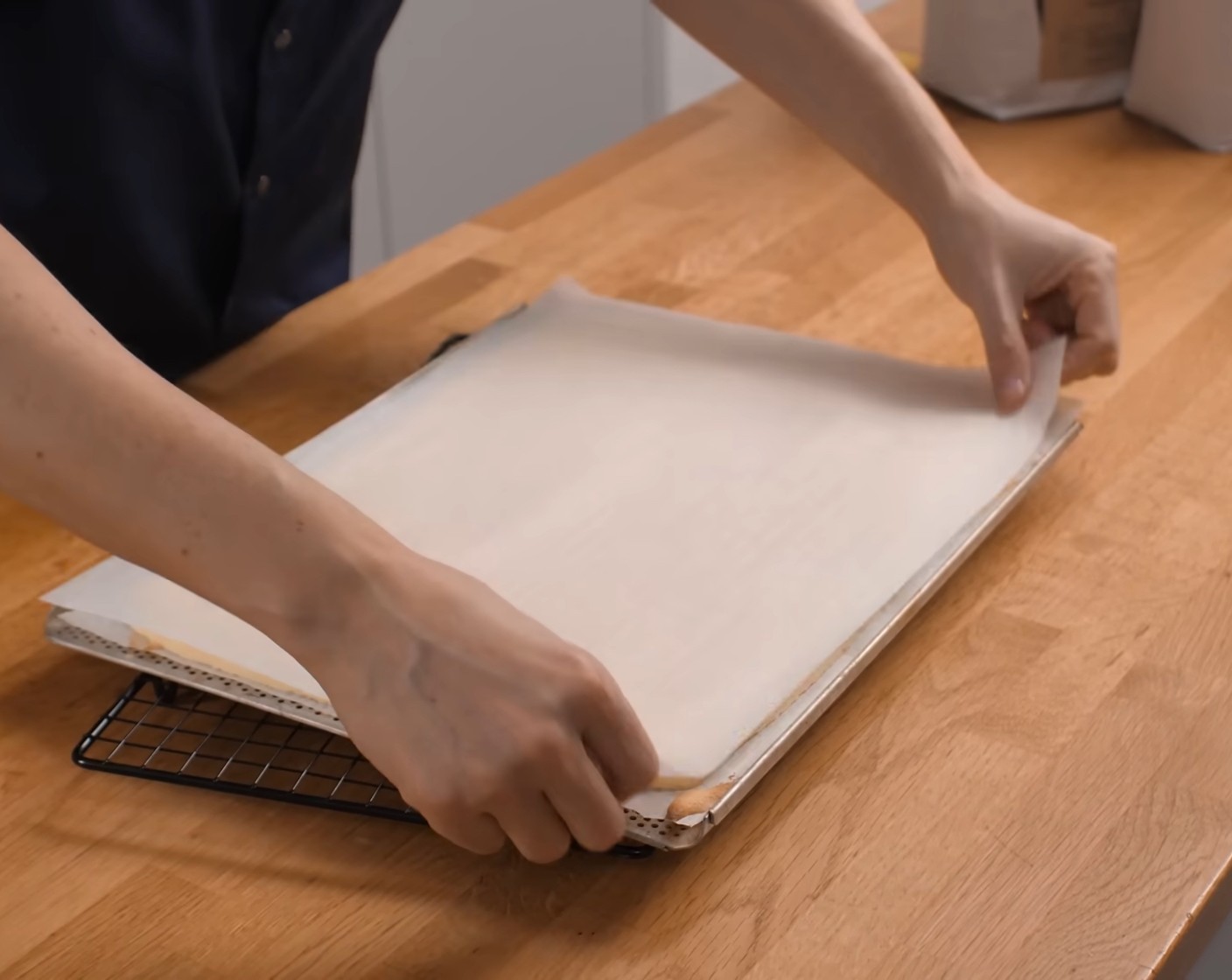 Nach dem Backen den Biskuitboden noch im heissen Zustand, mit einem Backpapier zudecken und auf das heisse Blech drehen.