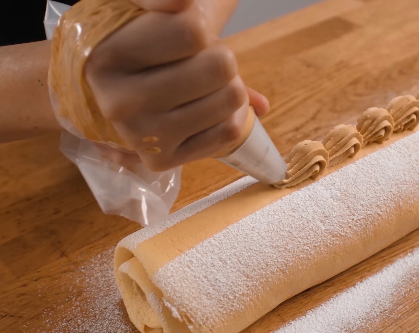 Die restliche Creme in einen Spritzbeutel mit Sterntülle geben und auf den freien Streifen auf der Biskuitrollen kleine Muscheln aufspritzen.
