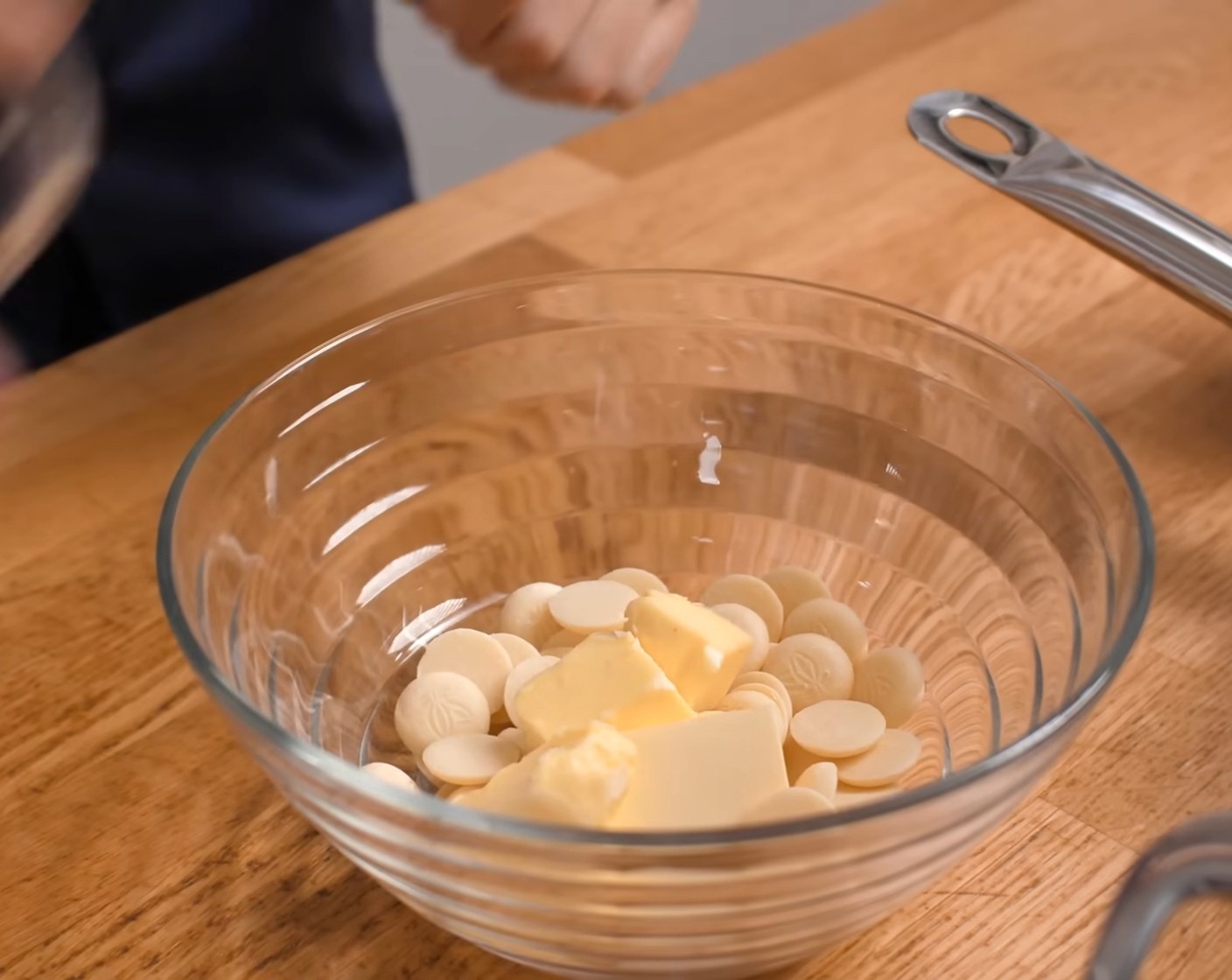 Die Butter (3 1/3 Esslöffel) zu den Kuvertüredrops (100 g) in eine Schüssel geben.