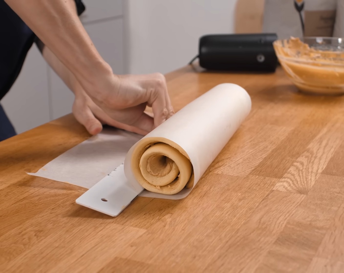 Die Biskuitrolle mit einem Massstab/Zollstock und mit Hilfe des Backpapiers noch etwas straffen.