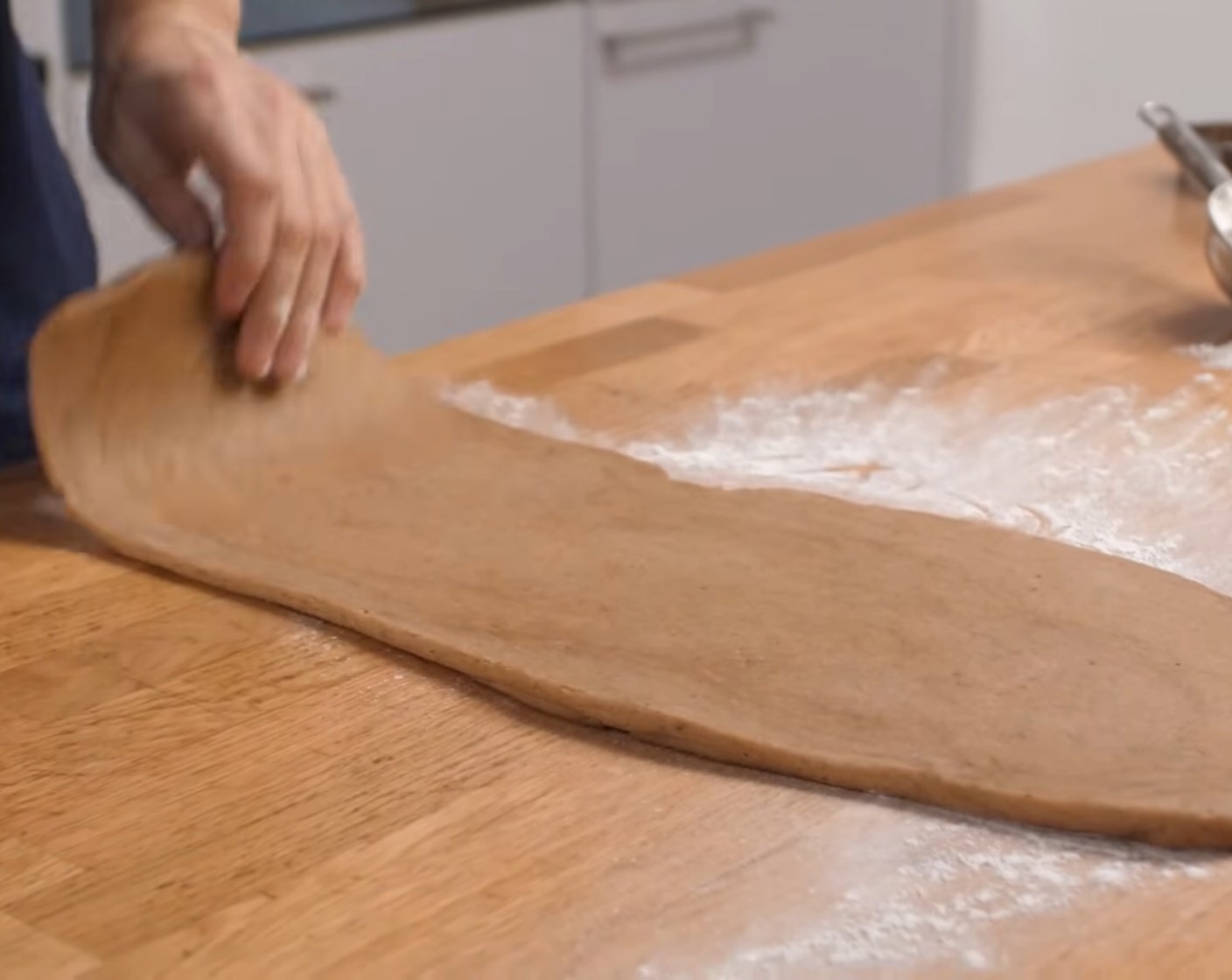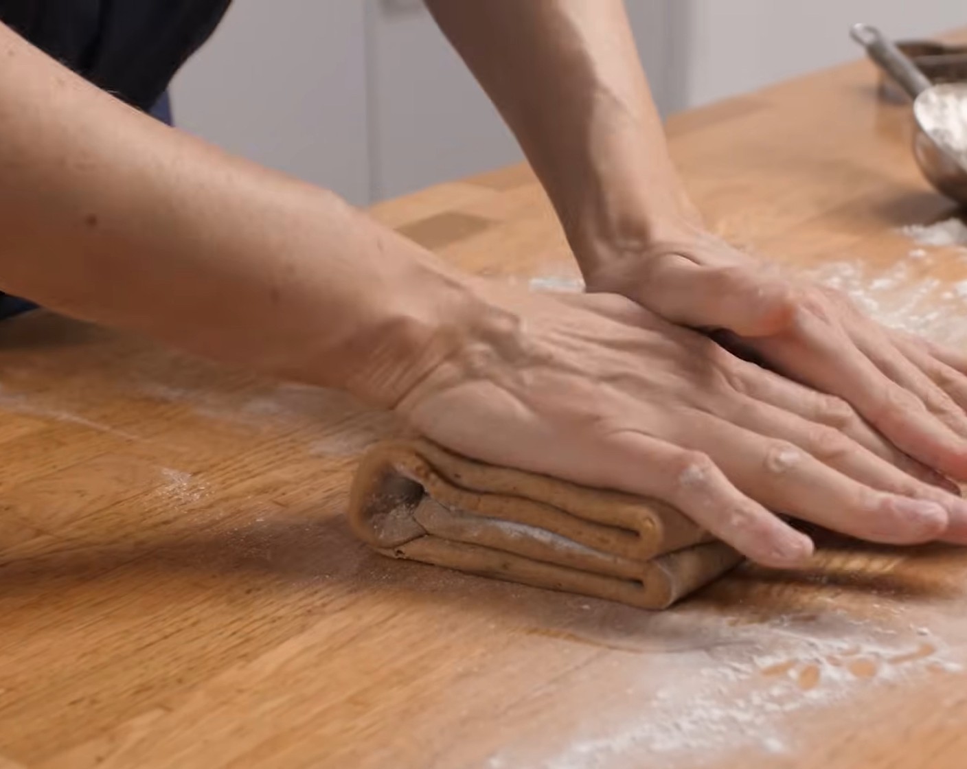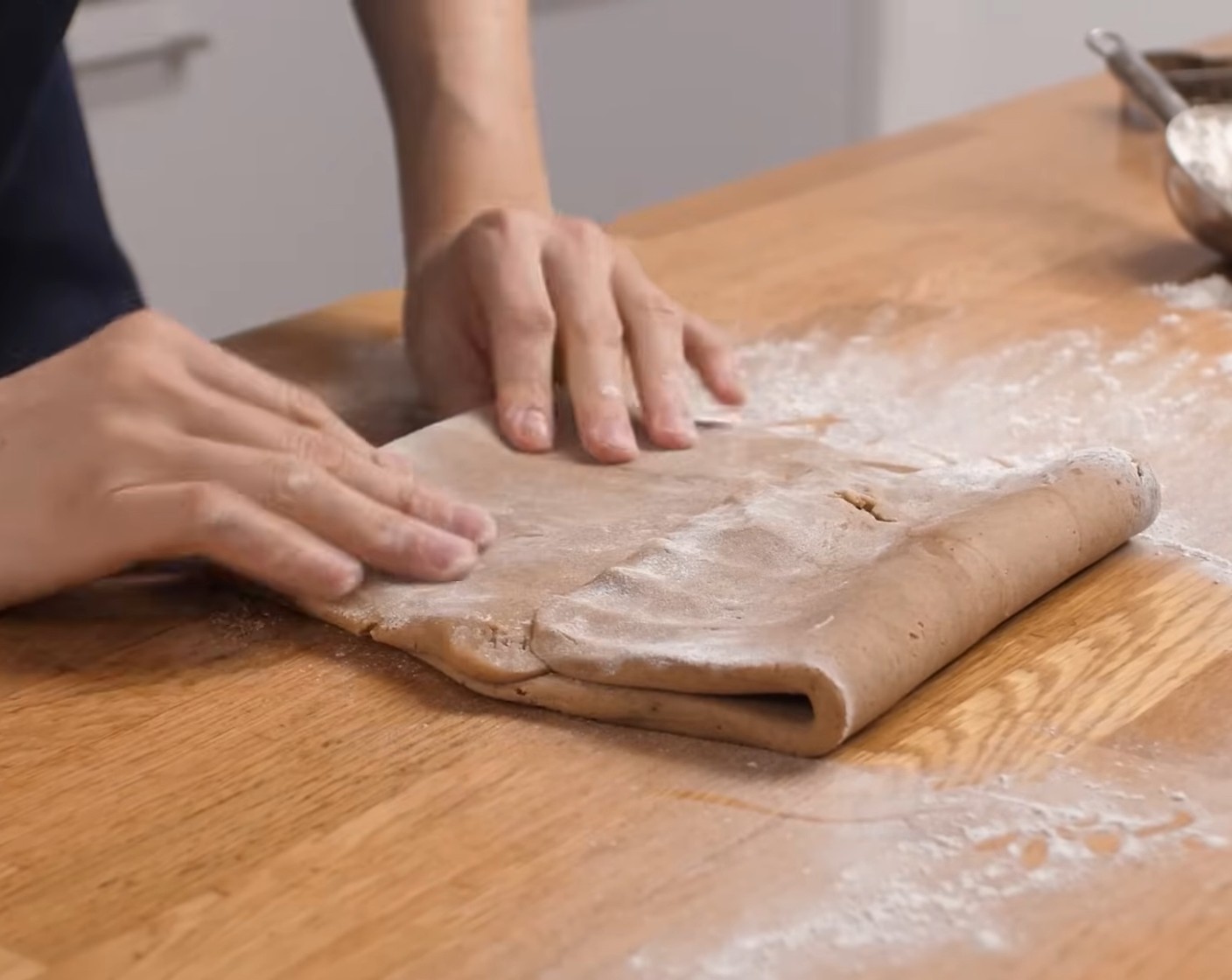 Danach den Teig nochmals in der Mitte einschlagen. Dadurch wird das Gluten im Mehl nochmals angeregt und die Lebkuchen laufen beim Backen weniger breit aus.