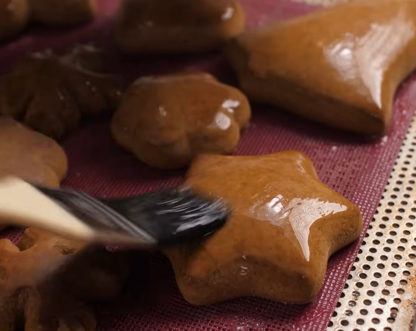 Die noch heissen Lebkuchen – direkt aus dem Ofen – mit der Glanzstreiche gleichmässig anstreichen.