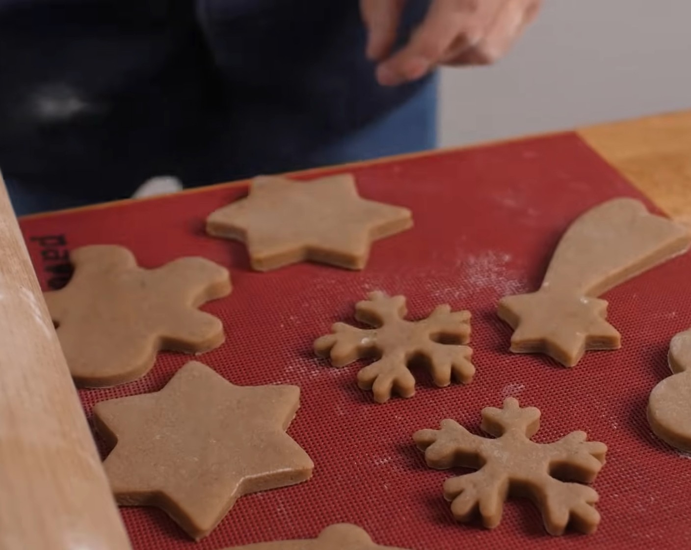 Den gefalteten Teig auf einer bemehlten Arbeitsfläche auf etwa 6 mm ausrollen, durchlockern und die gewünschten Formen ausstechen.