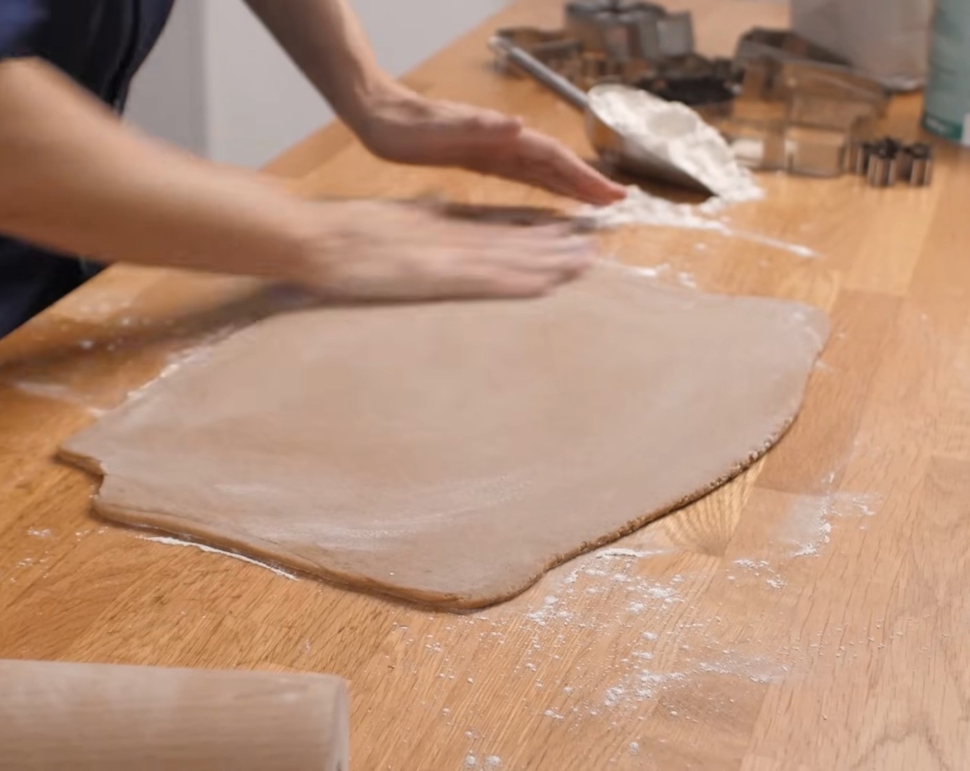 Den gut gelagerten Lebkuchenteig auf etwas Mehl etwa 8 mm ausrollen.