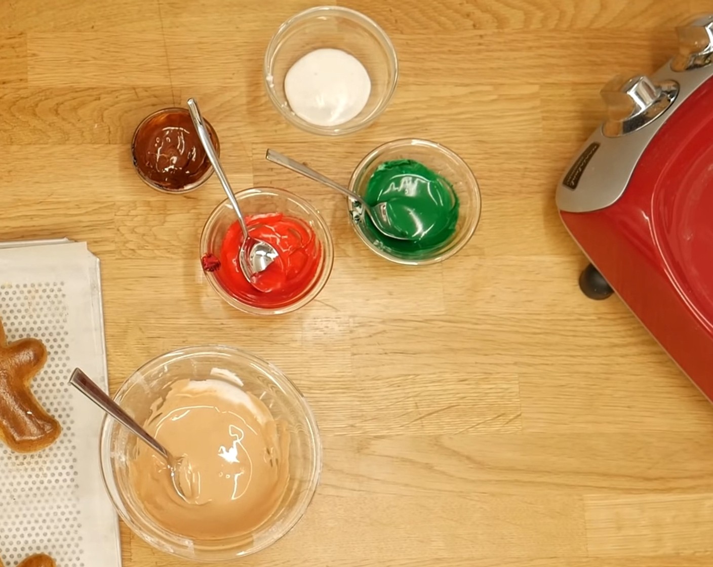 Die etwa die Hälfte des Royal Icings in eine Schüssel geben und mit brauner Lebensmittelfarbe (wenig) einfärben. Das restliche Royal Icing auf 4 weitere Schalen aufteilen und mit roter Lebensmittelfarbe (wenig), grüner Lebensmittelfarbe (wenig) und schwarzer Lebensmittelfarbe (wenig) einfärben.