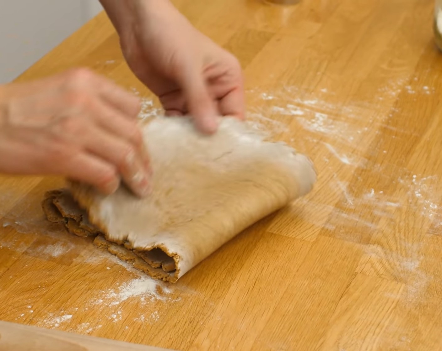 Danach den Teig nochmals in der Mitte einschlagen. Dadurch wird das Gluten im Mehl nochmals angeregt und die Lebkuchen laufen beim Backen weniger breit aus.