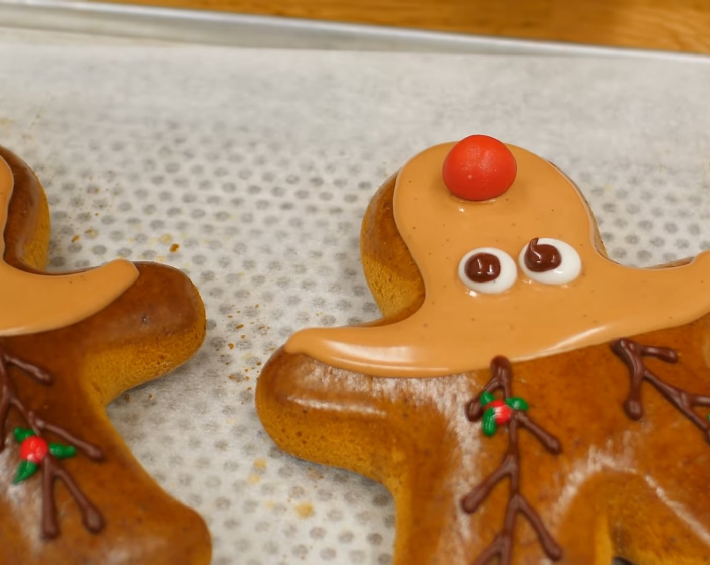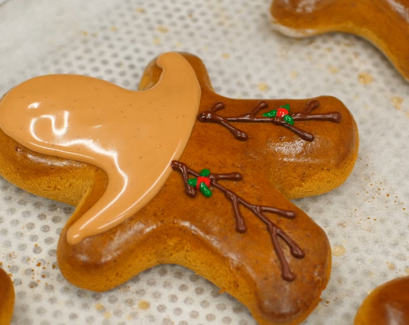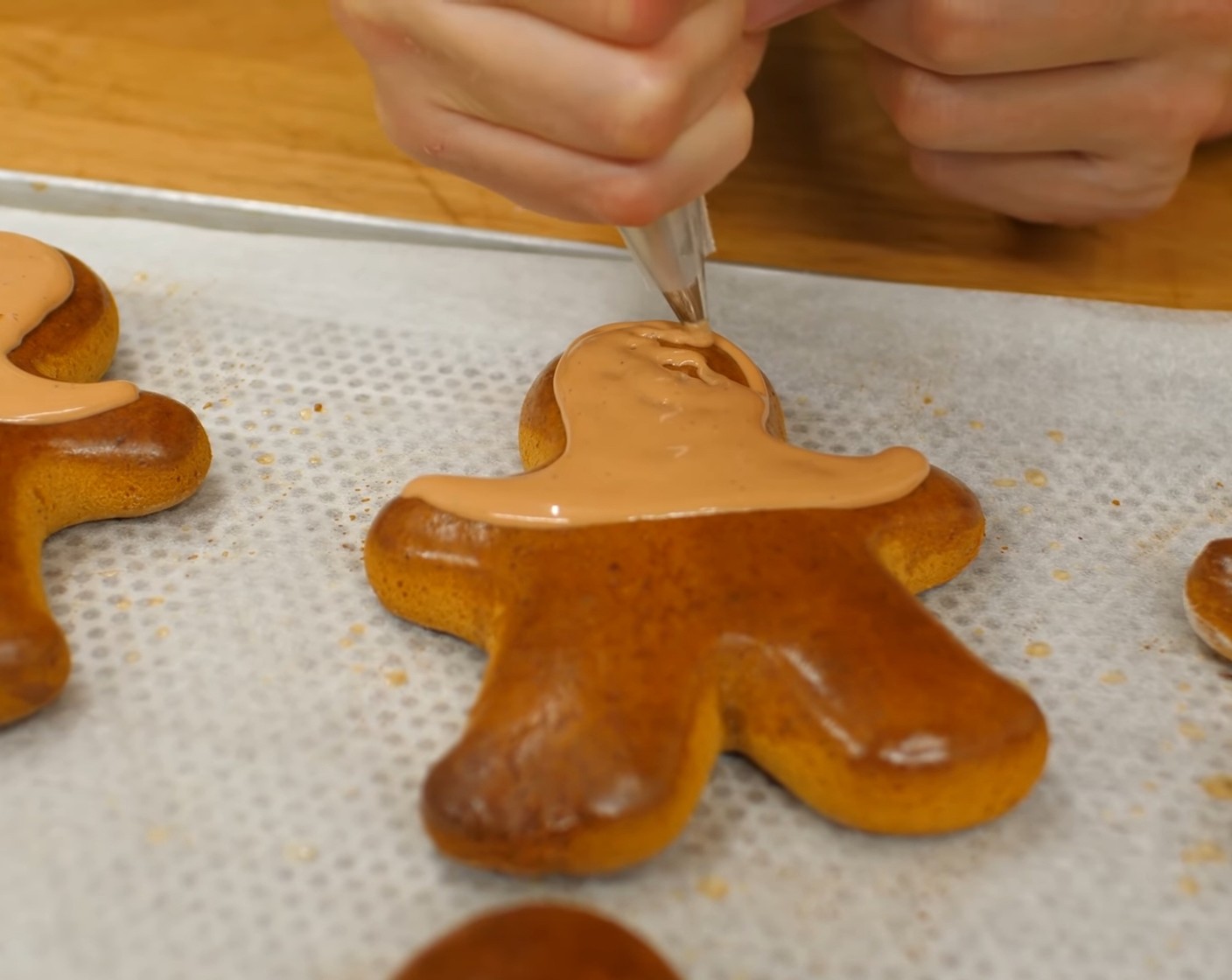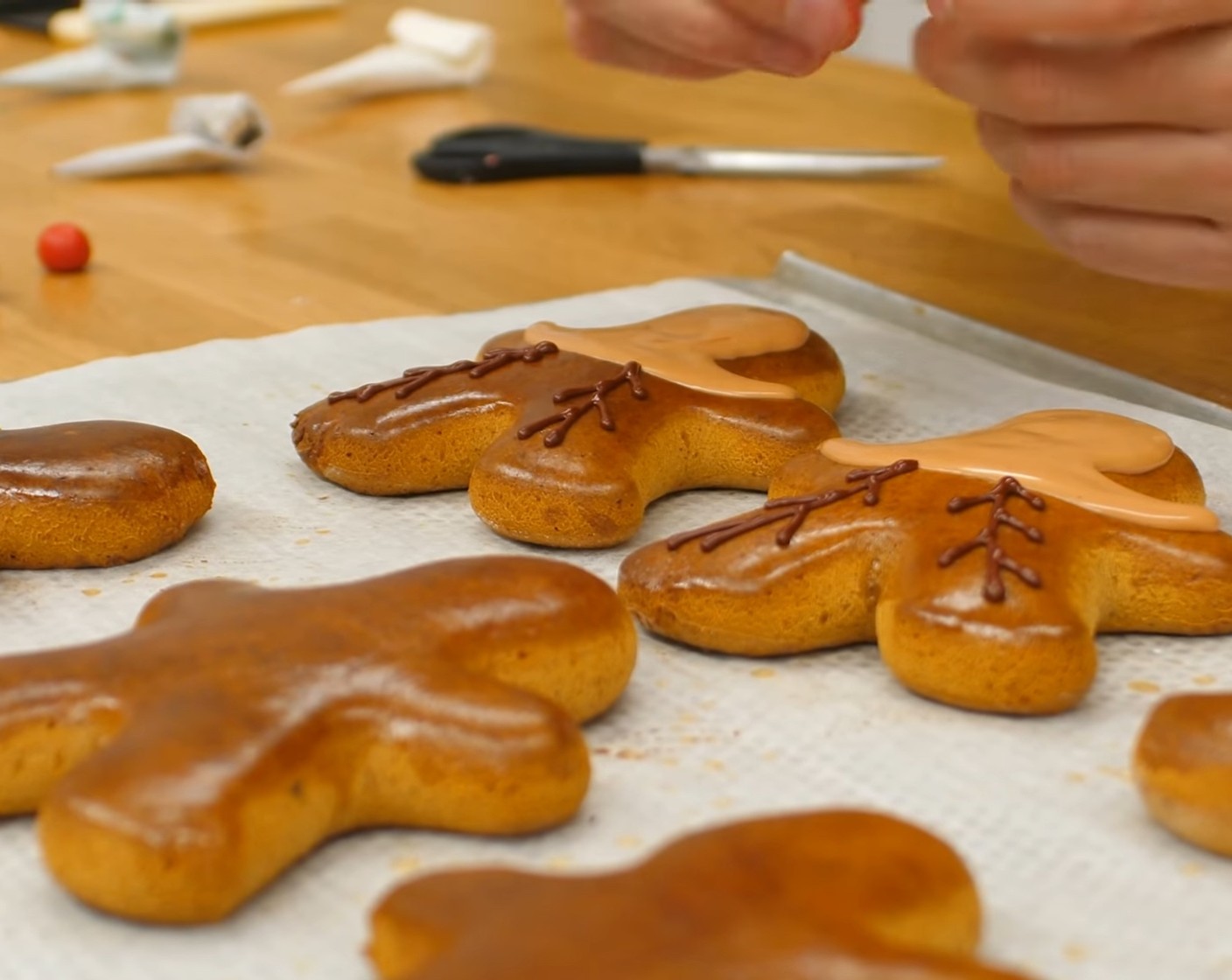 Die Lebkuchen-Männchen mit dem Kopf nach unten vor sich hinlegen. Danach mit dem Royal Icing den Rand des Kopfes und bis etwa in die Hälfte der Arme bespritzen, so dass die Schnauze des Rentieres entsteht. Diese Markierung vorsichtig mit Royal Icing ausfüllen. Tipp: Sollte das Royal Icing zu fest sein, ein paar wenige Tropfen Wasser darunter rühren.