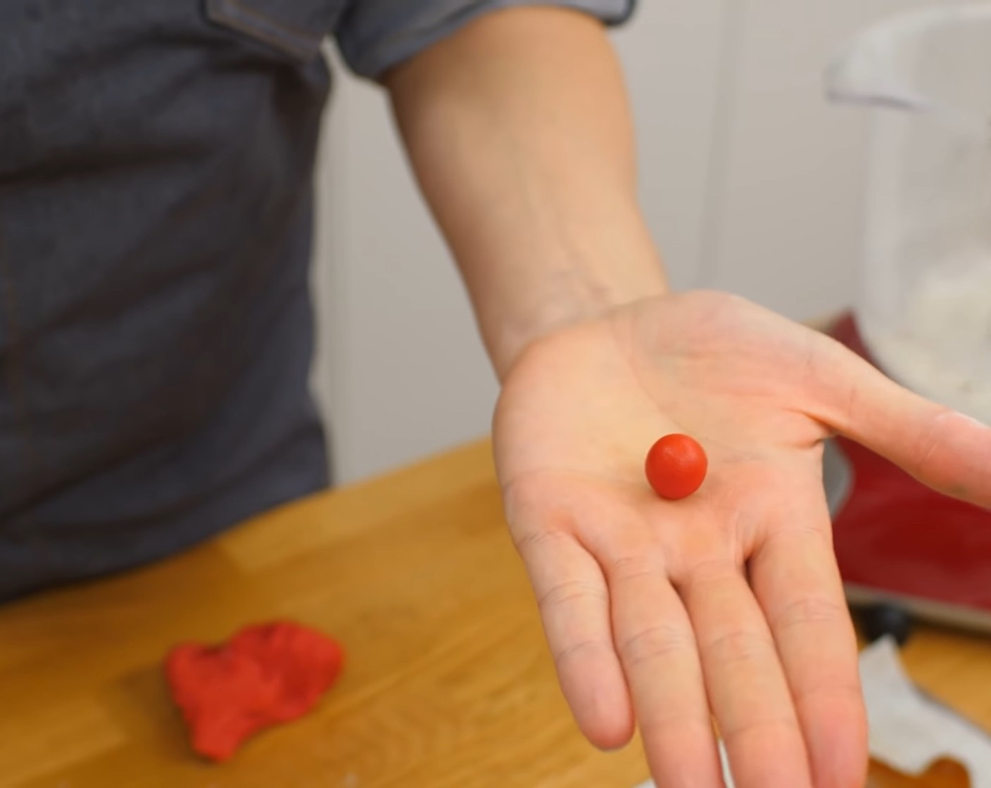 Den Rollfondant (wenig) gut durchkneten und dann daraus kleine Kugeln mit etwa 1 cm Durchmesser formen.