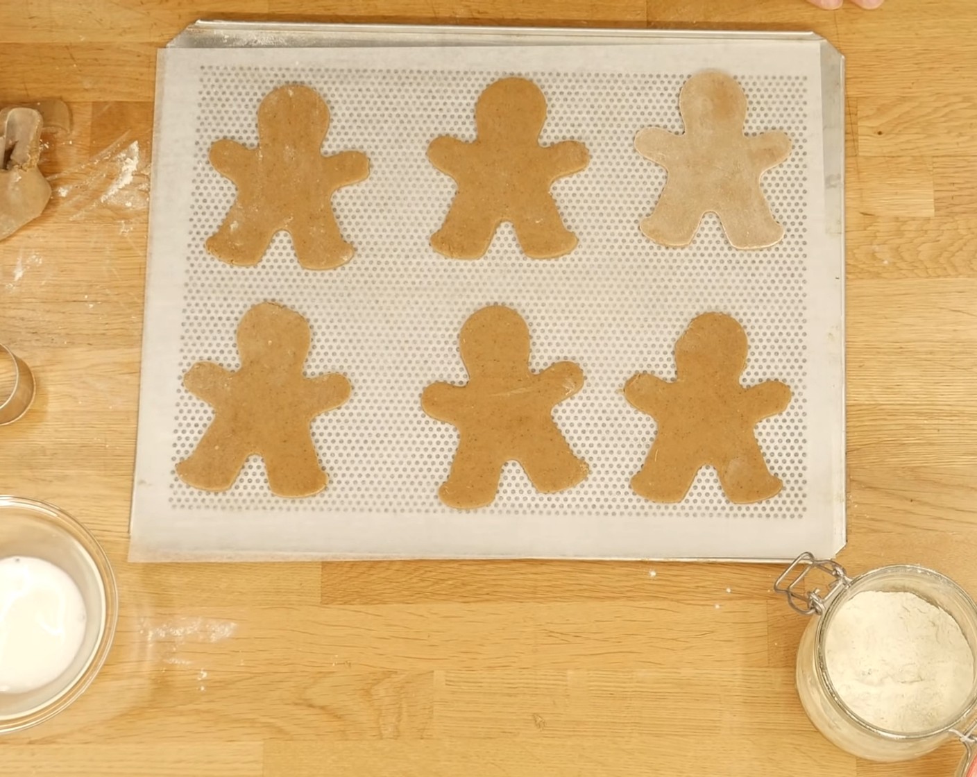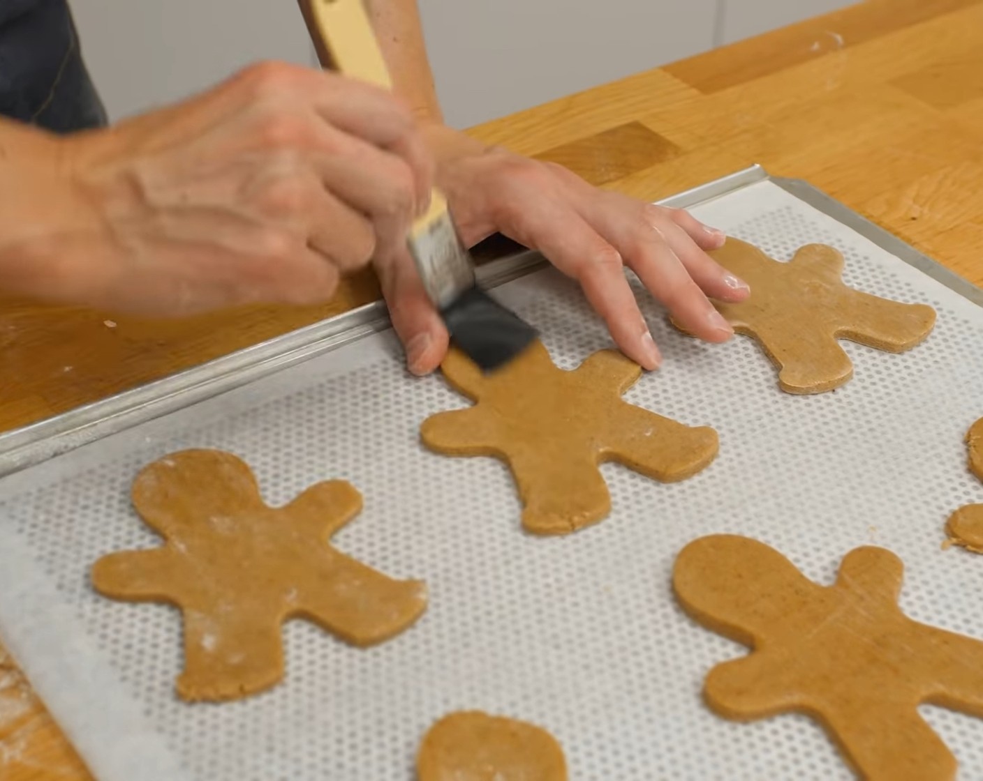 Den Teig nochmals ca. 5 mm Dicke ausrollen und etwas durchlockern. Danach das Mehl auf der Oberfläche des Teiges mit den Händen wegwischen und Lebkuchenmännchen ausstechen. Die Männchen auf ein mit Backpapier belegtes Blech legen.