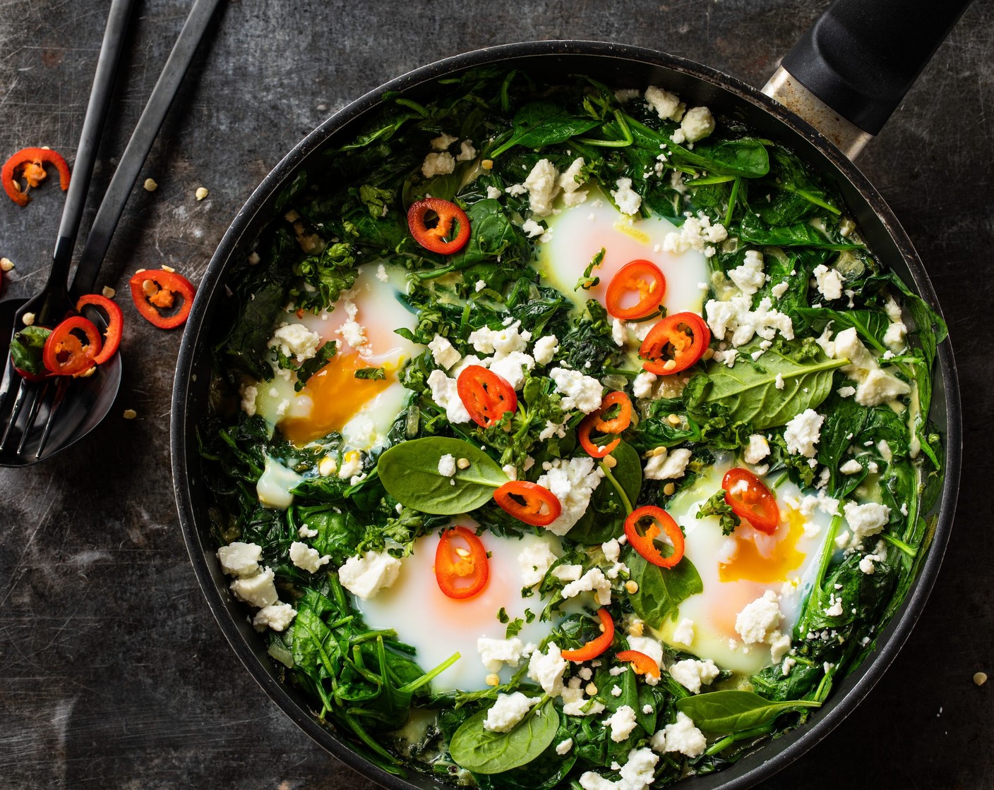 Shakshuka mit Spinat ist eine gesunde und leckere Abwechslung zum Originalrezept. Spinat und Ei passen immer. Chilli sorgt für Pep. Chochdoch mit Muriel.