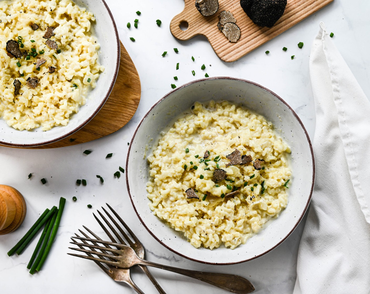 Dieser Duft! Dieser Geschmack! Exquisit! Dieses sämige Risotto mit frischen Trüffeln eignet sich auch allein hervorragend als edles, vegetarisches Weihnachtsessen!