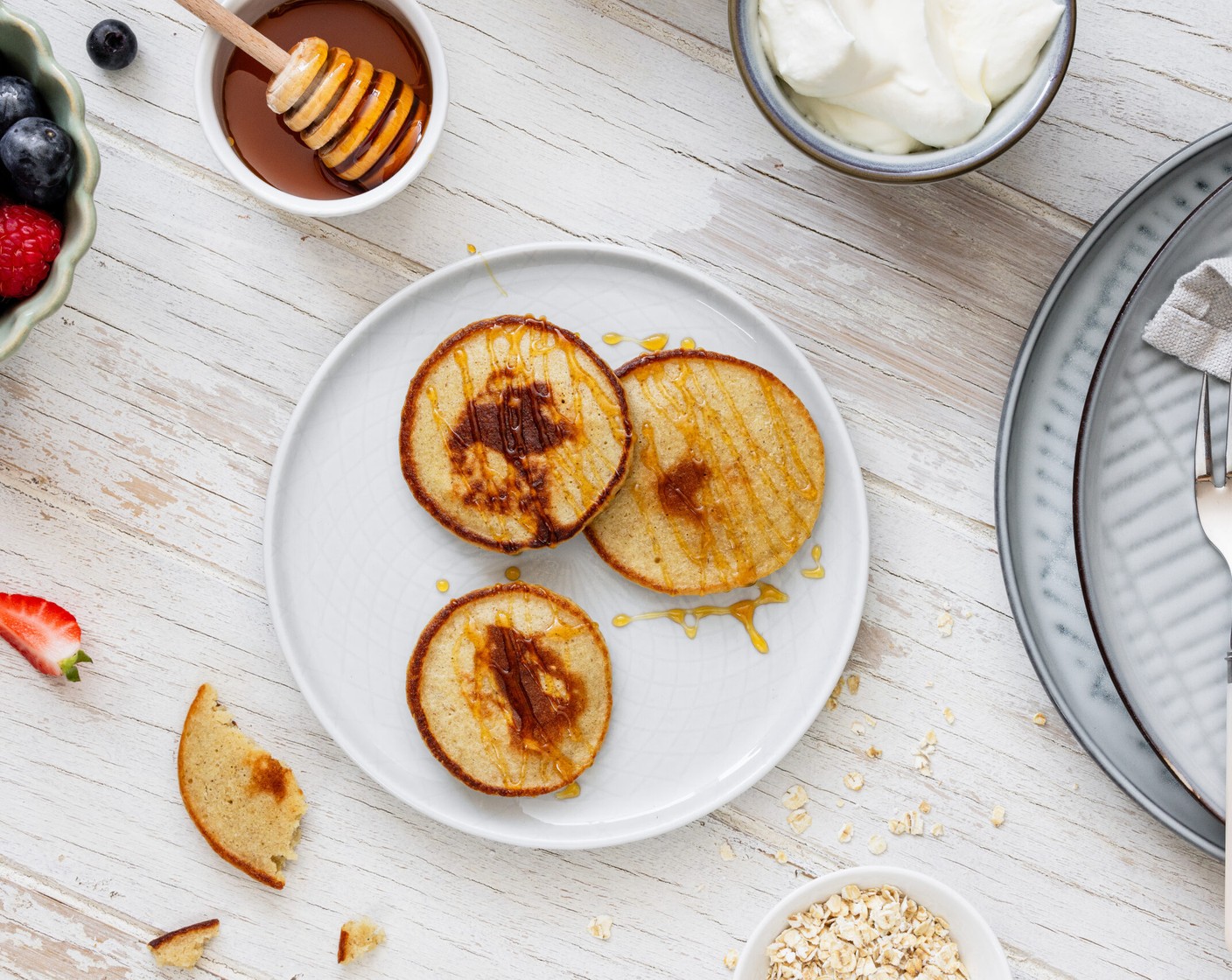 Vollwertig und chuschtig schmecken diese Pancakes auf der Basis von Haferflocken mit Milch, Buttermilch oder verdünntem Joghurt. Je nach Gusto.