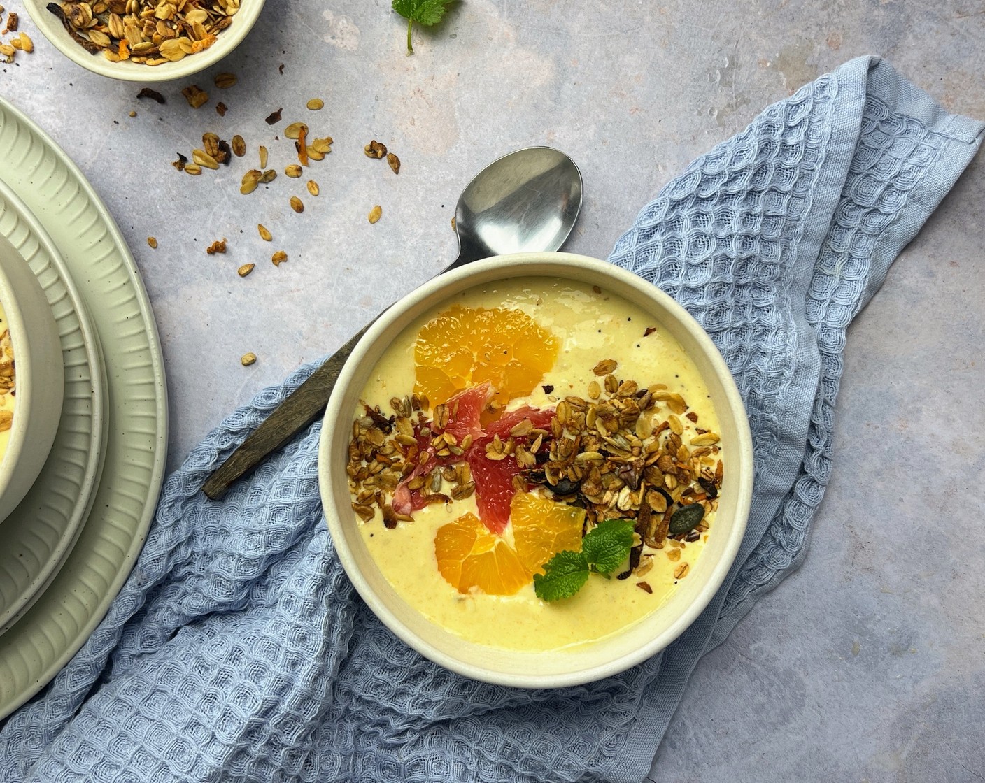 Diese Zitrus-Kurkuma-Bowl bringt nicht nur Farbe in deine Schüssel, sondern auch wertvolle Nährstoffe in deinen Tag. Diese Bowl steckt voller Vitamin C und Ballaststoffe – perfekt für ein energiegeladenes Frühstück oder einen ausgewogenen Snack.