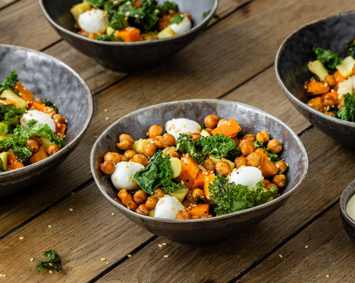 Den Zauber des Orients wirst du bei diesem Salat aus gerösteten Kichererbsen, Ofengemüse, Federkohl, Kreuzkümmel und Tahini-Dressing erleben.
