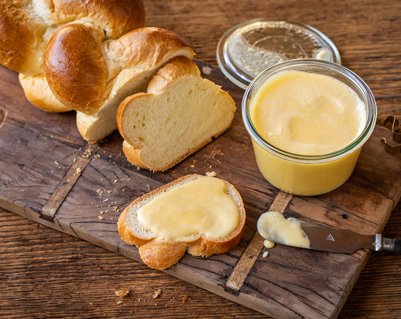 Köstlicher Brotaufstrich. Hierfür werden Eigelb, Rahm, Zucker, Vanillestängel und Butter verwendet.